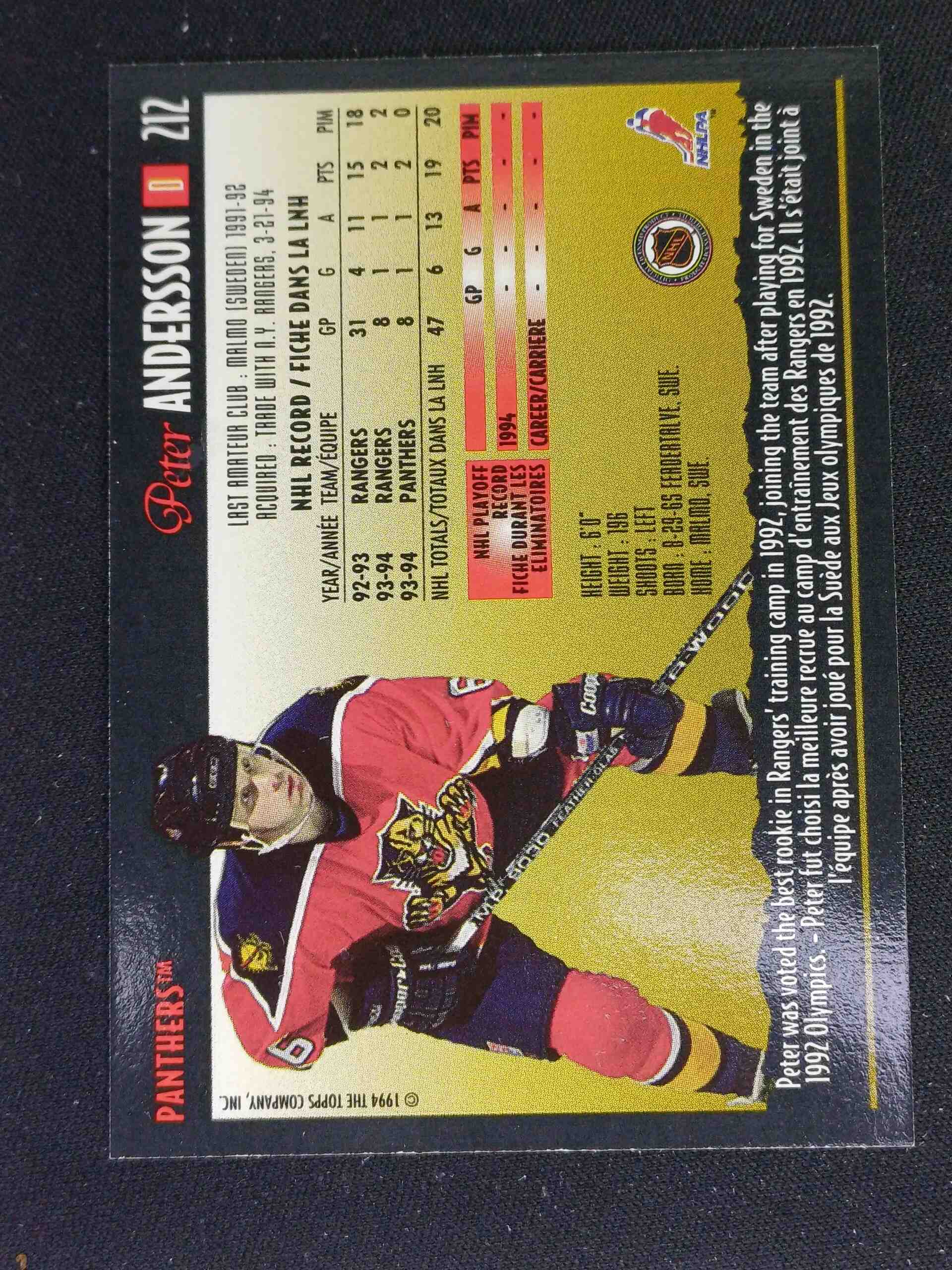 Sběratelská karta 1994/1995 Topps OPC Premier Special Effects 212 Peter Andersson Paralel