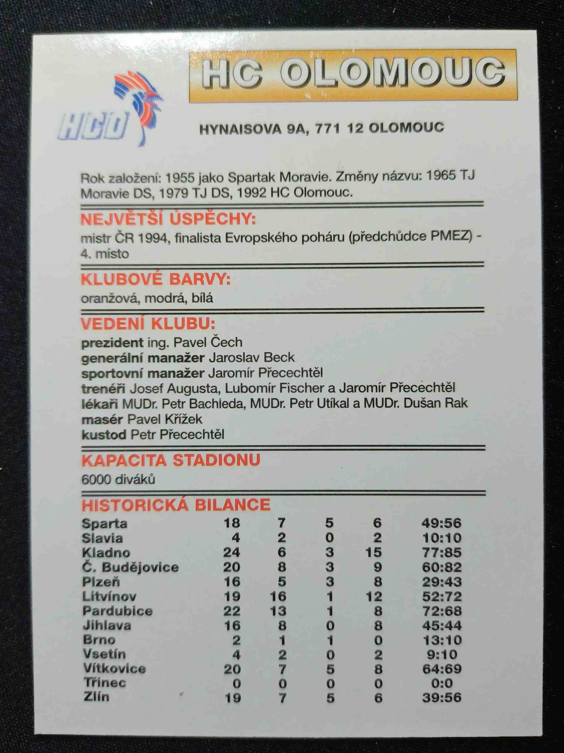 Sběratelská karta 1995/1996 APS Cards HC Olomouc Inzert