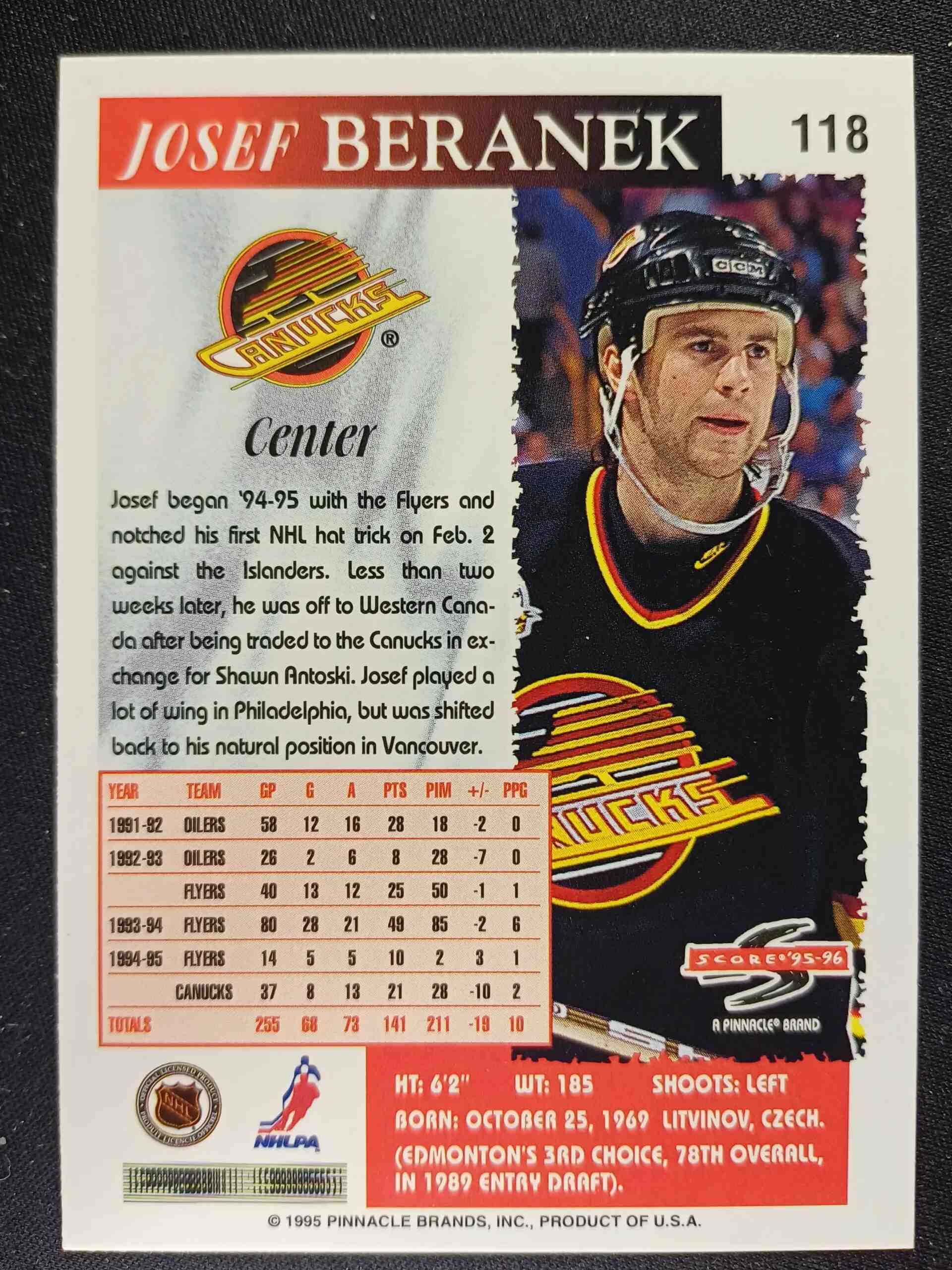Sběratelská karta 1995/1996 Pinnacle Score Base 118 Josef Beranek