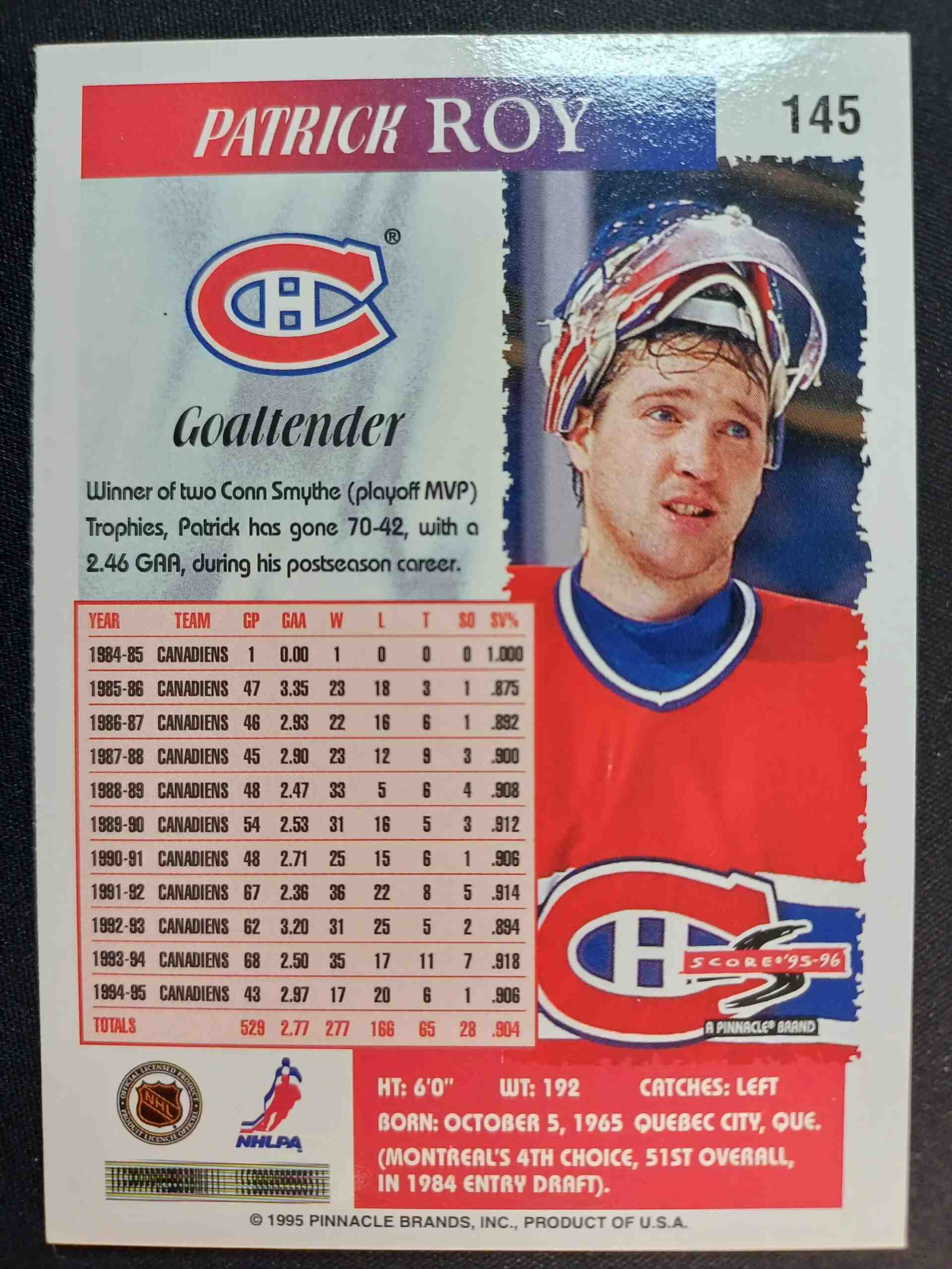 Sběratelská karta 1995/1996 Pinnacle Score Base 145 Patrick Roy