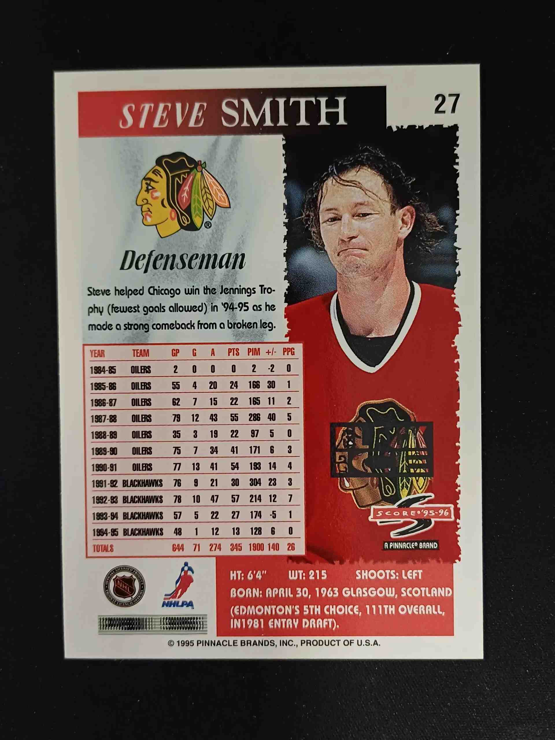 Sběratelská karta 1995/1996 Pinnacle Score Black Ice 27 Steve Smith Paralel