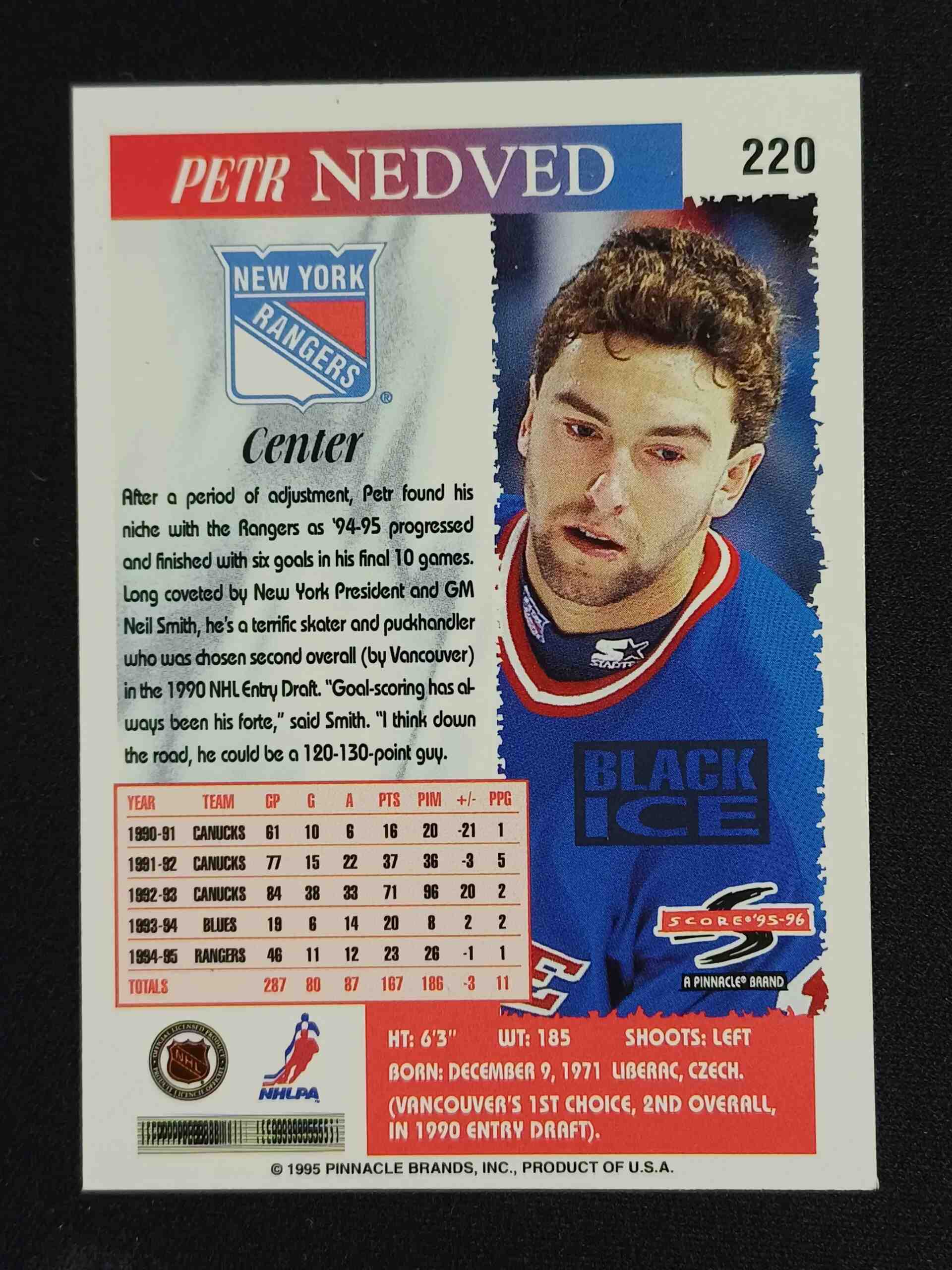 Sběratelská karta 1995/1996 Pinnacle Score Black Ice Artist Proof 220 Petr Nedved Paralel