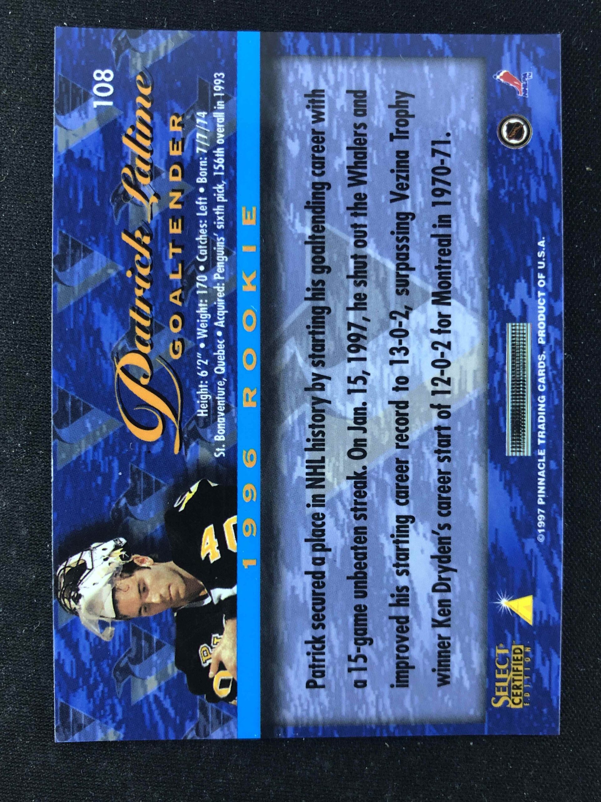 Sběratelská karta 1996/1997 Pinnacle Select Certified Base 108 Patrick Lalime