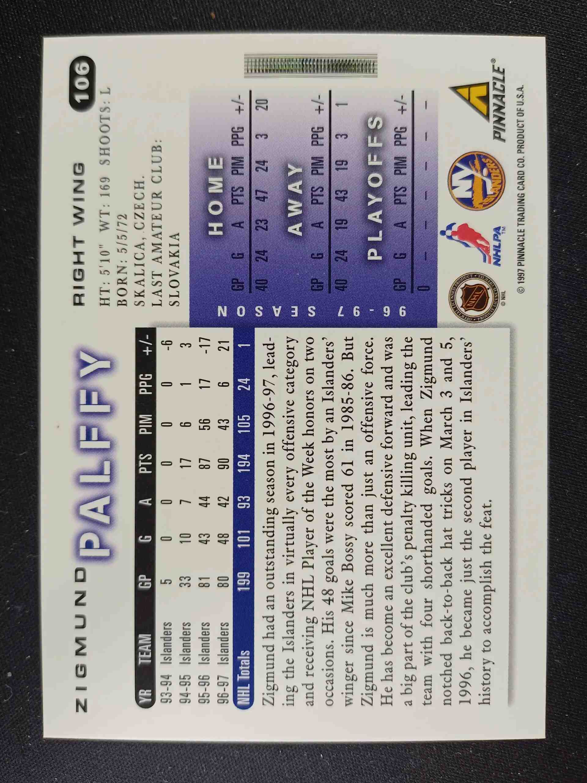 Sběratelská karta 1997/1998 Pinnacle Score Base 106 Zigmund Palffy
