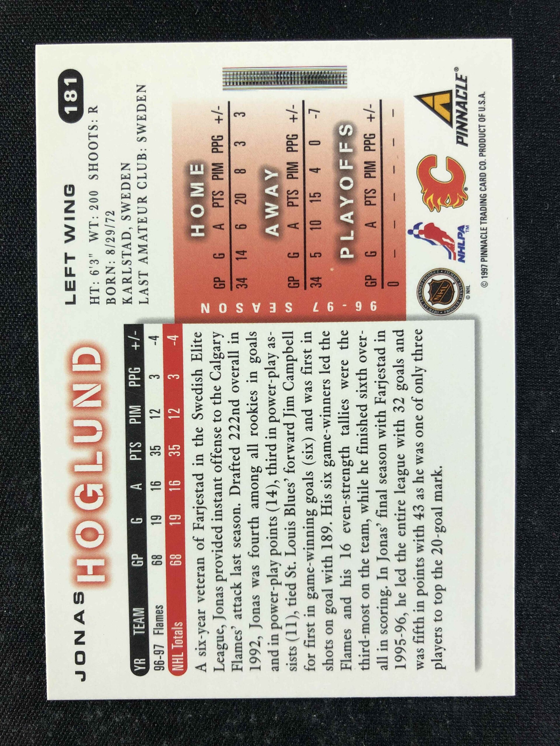 Sběratelská karta 1997/1998 Pinnacle Score Base 181 Jonas Hoglund