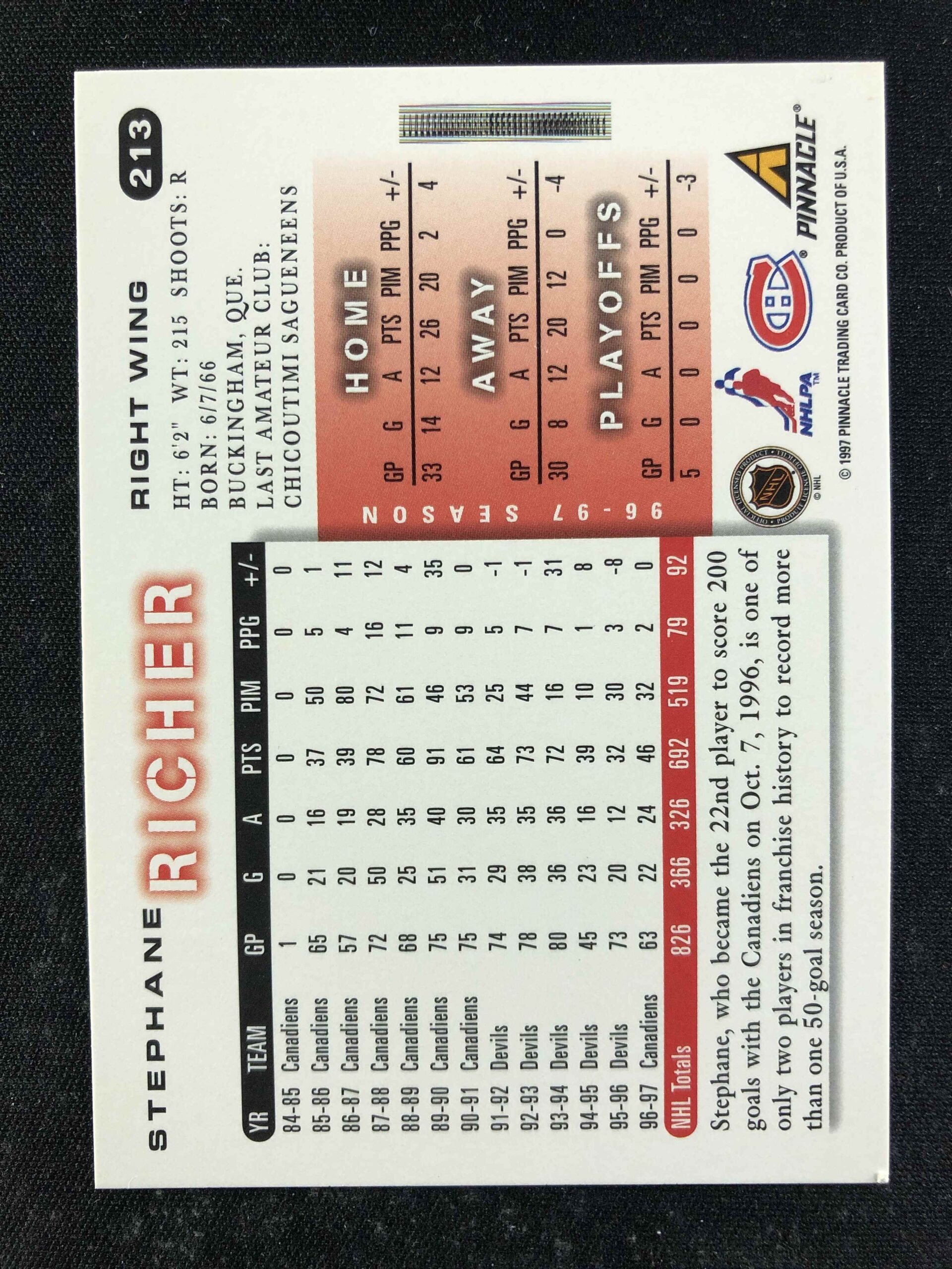 1997/1998 Pinnacle Score Base 213 Stephane Richer
