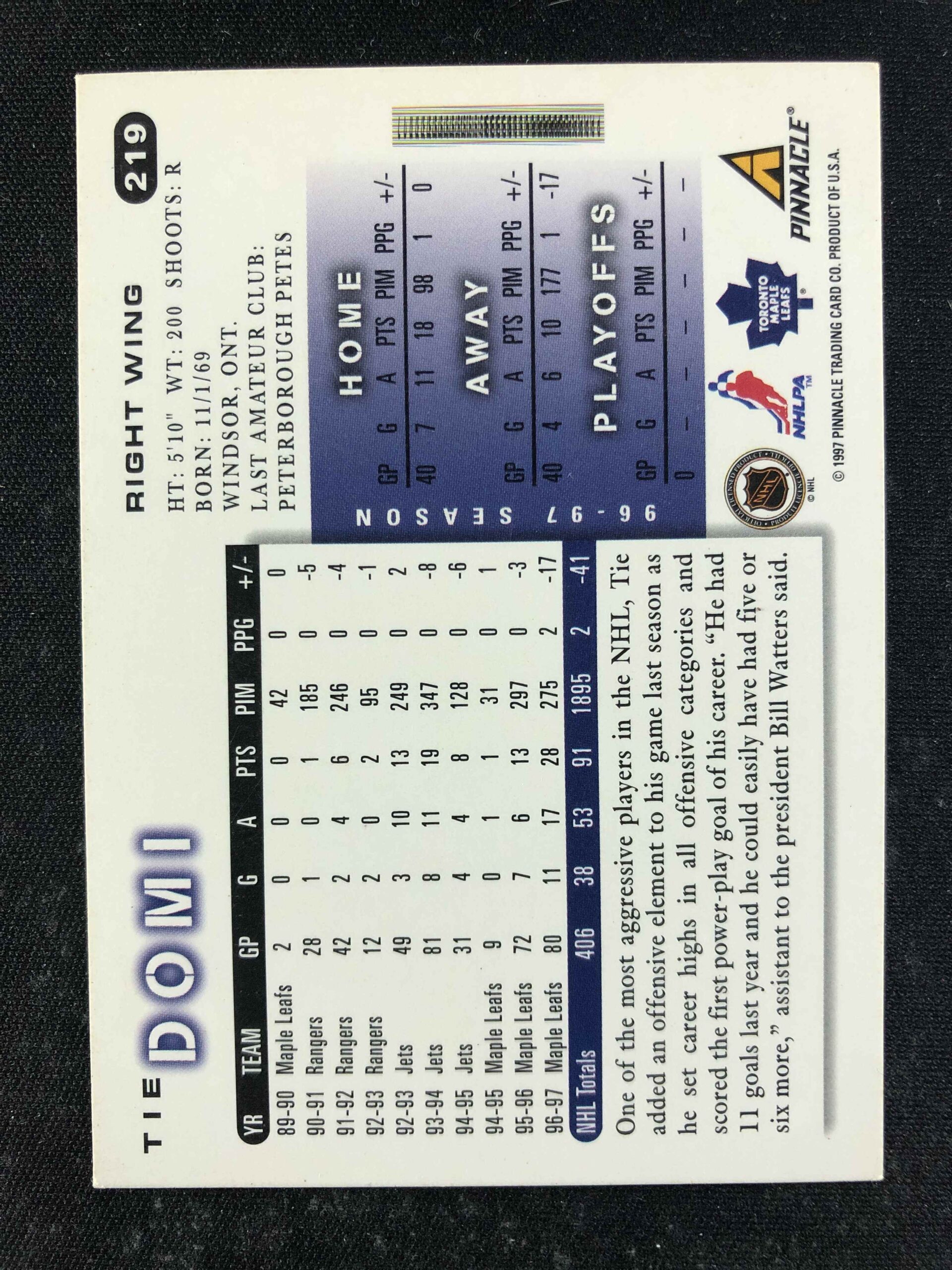 Sběratelská karta 1997/1998 Pinnacle Score Base 219 Tie Domi