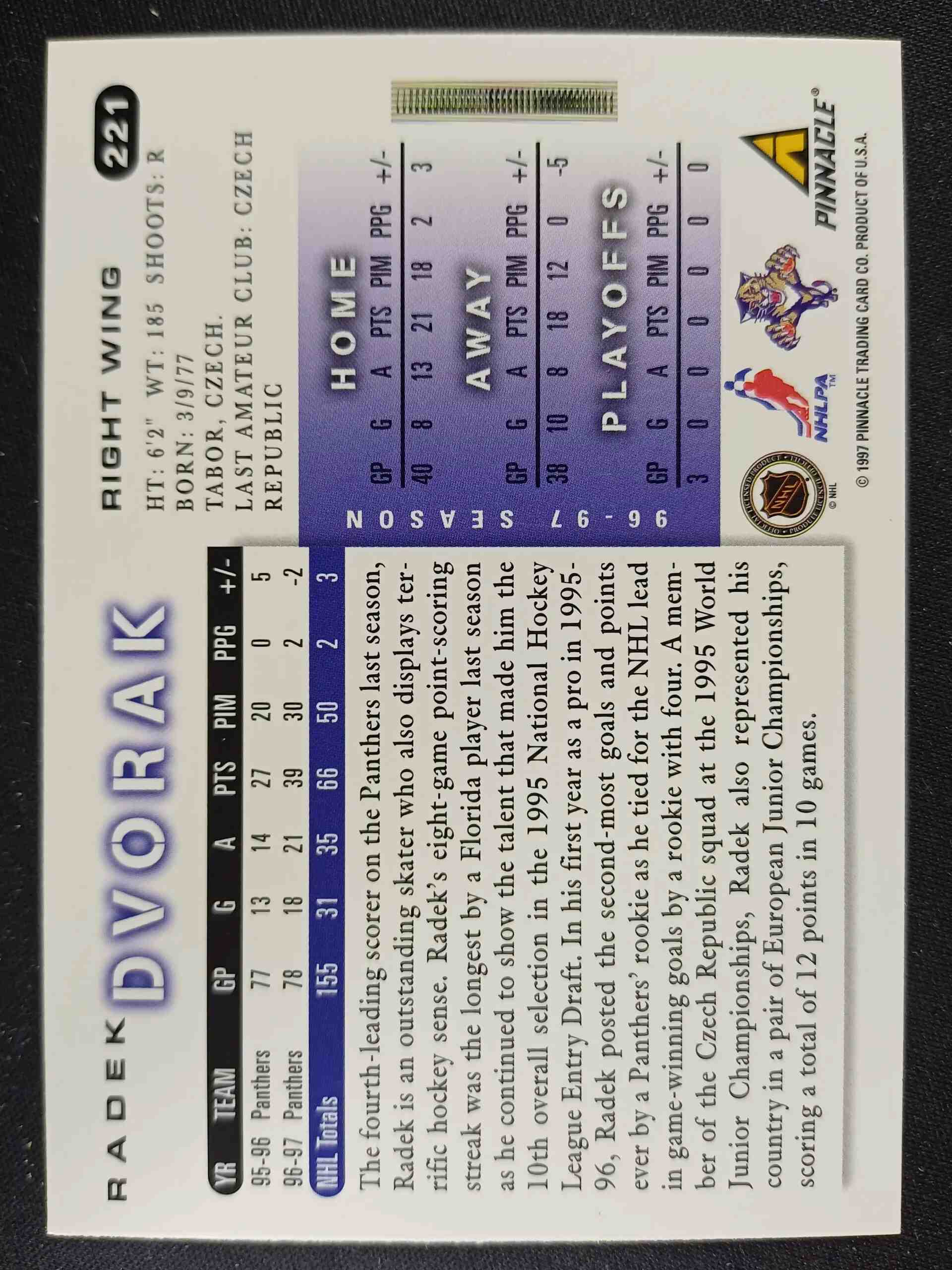 Sběratelská karta 1997/1998 Pinnacle Score Base 221 Radek Dvorak