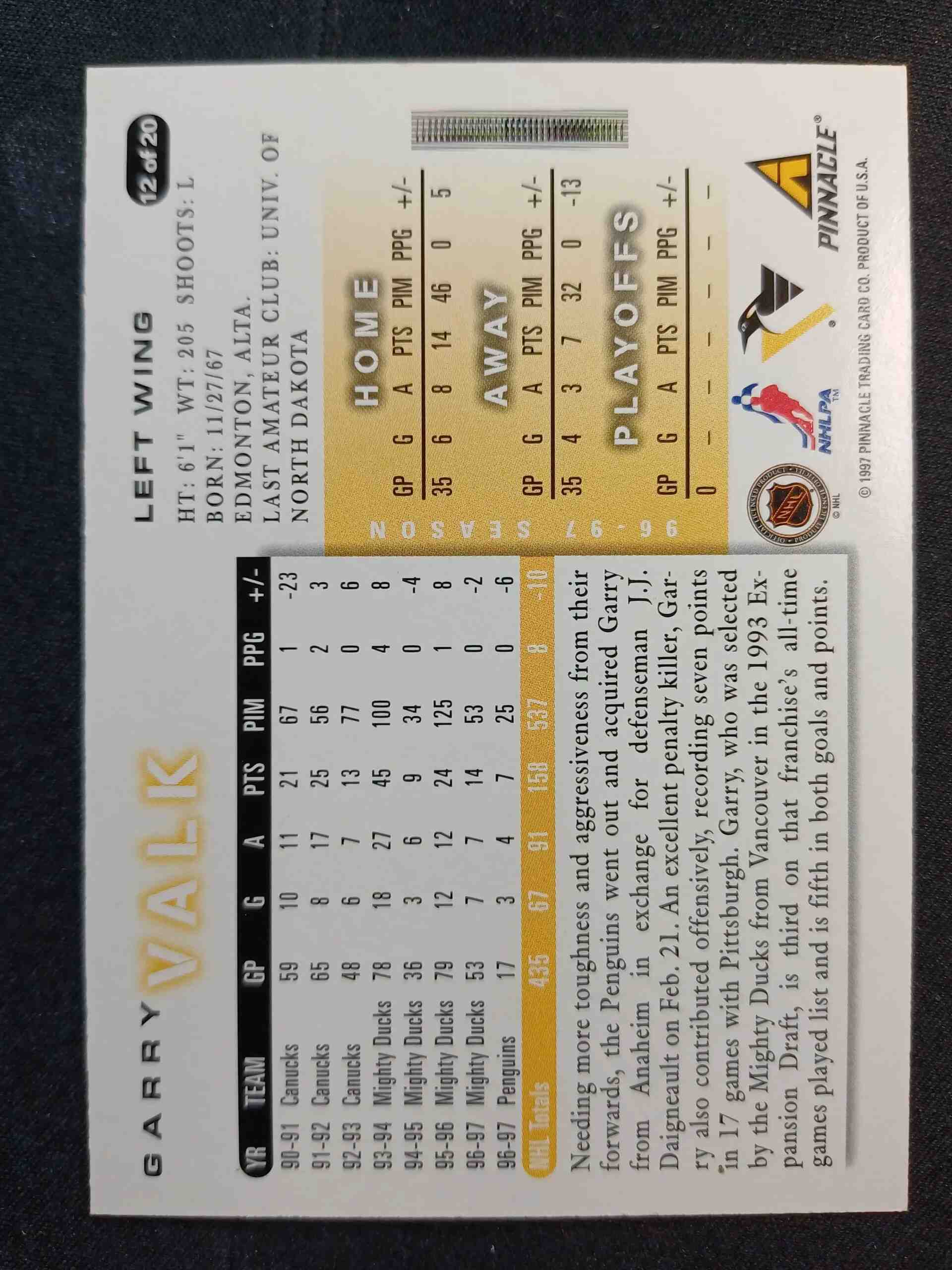 Sběratelská karta 1997/1998 Pinnacle Score team set Pittsburgh Penguins Base 12 of 20 Garry Valk
