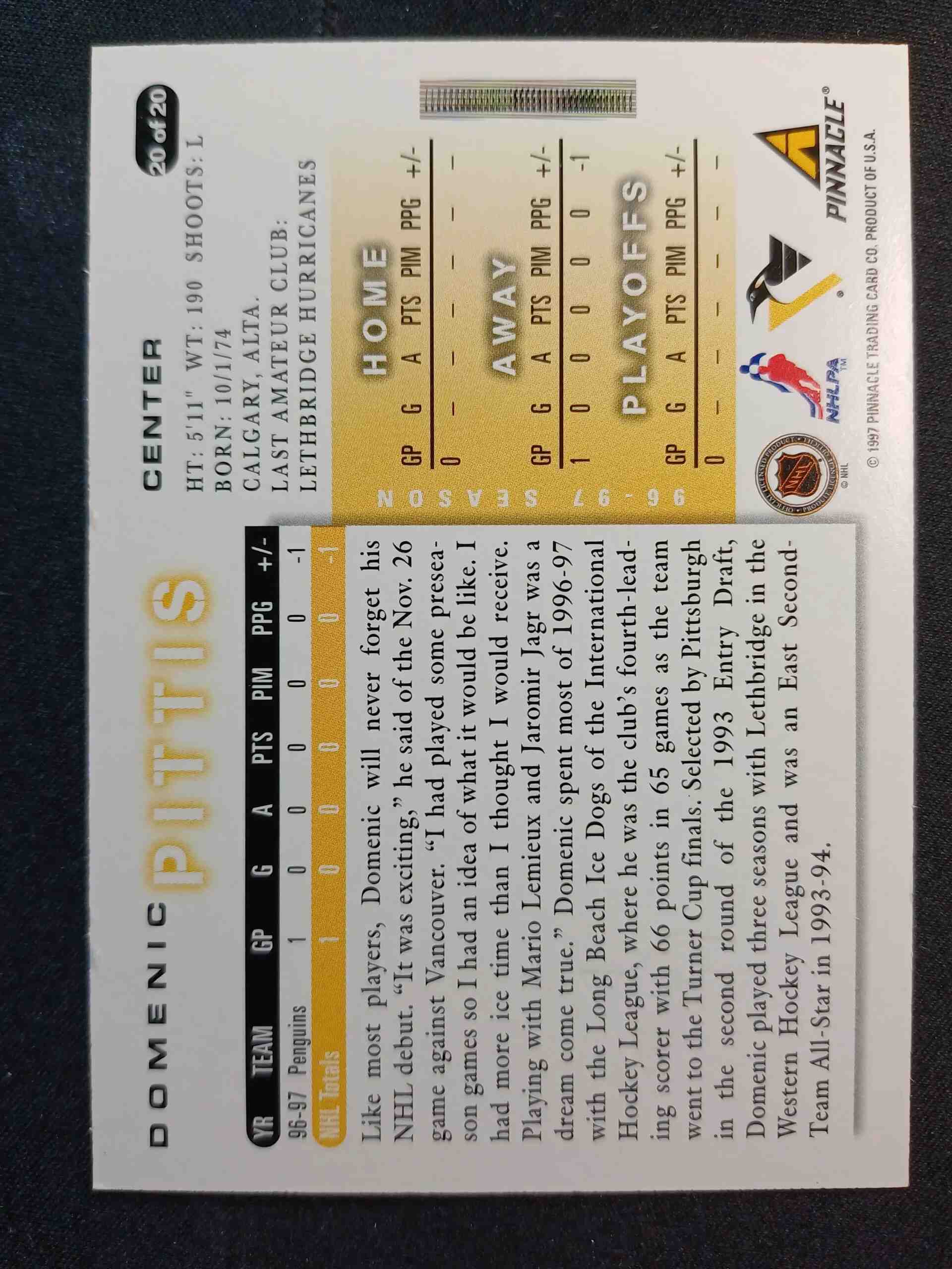 Sběratelská karta 1997/1998 Pinnacle Score team set Pittsburgh Penguins Base 20 of 20 Domenic Pittis