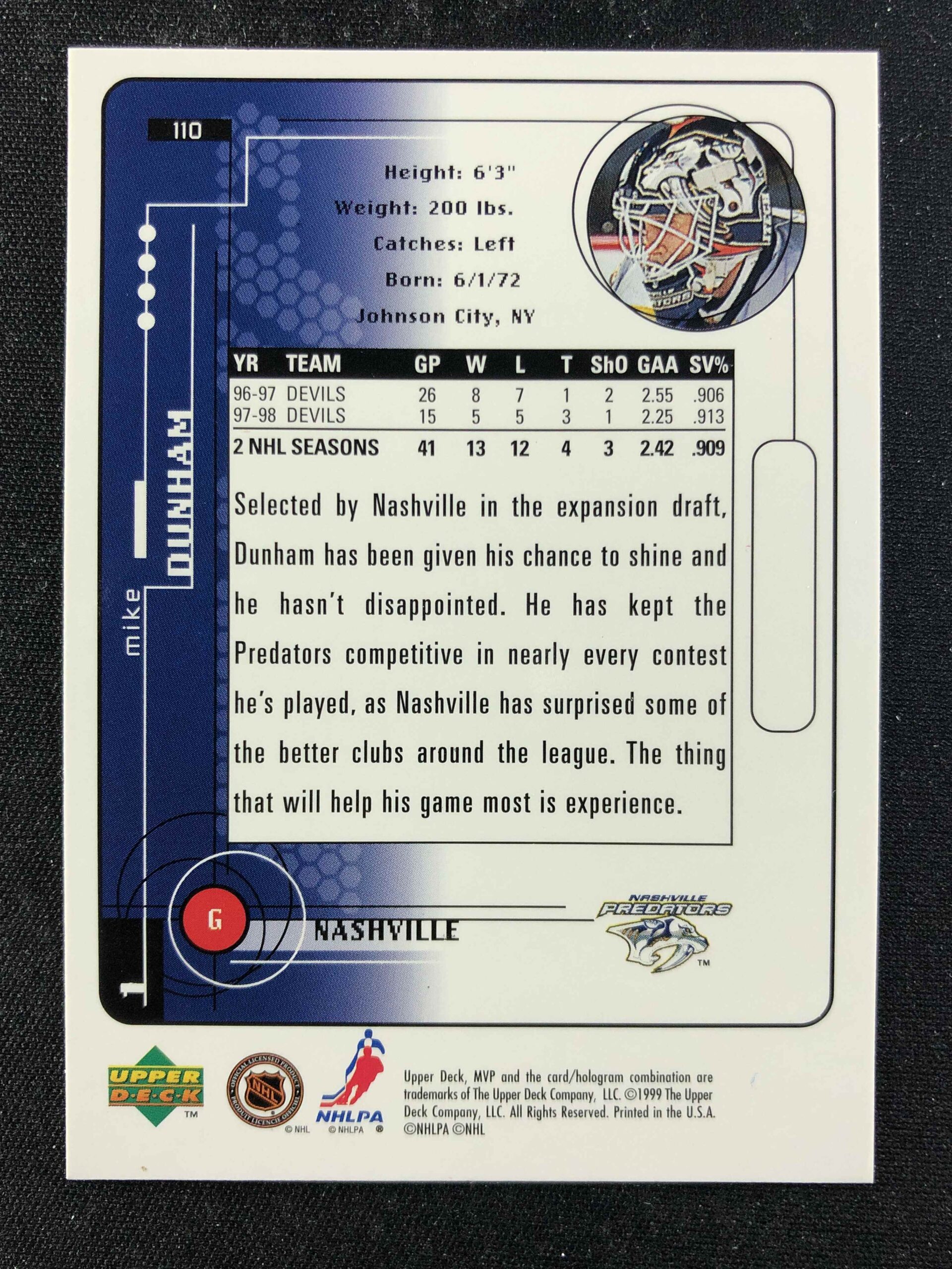 Sběratelská karta 1998/1999 Upper Deck MVP Base 110 Mike Dunham