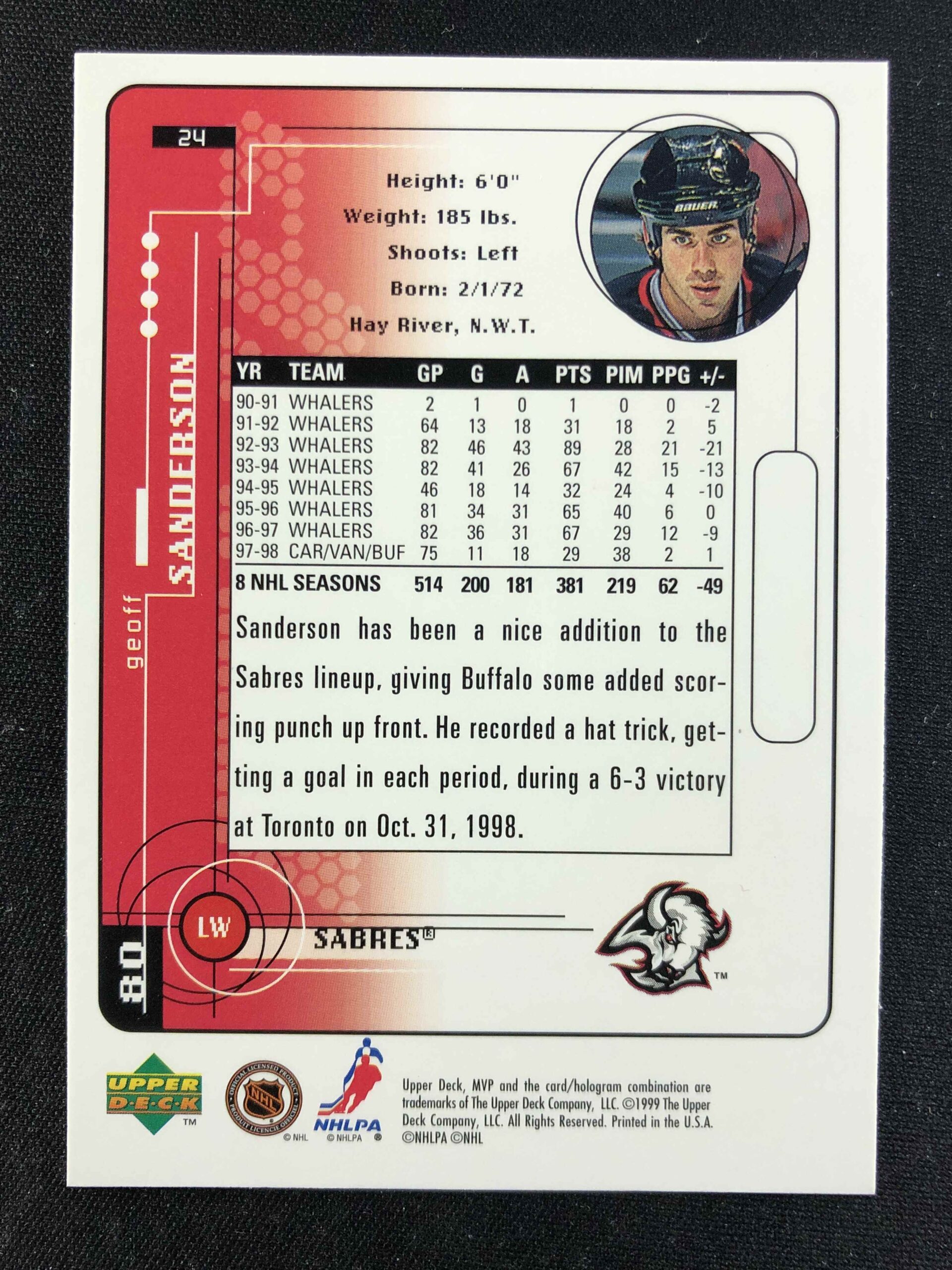 Sběratelská karta 1998/1999 Upper Deck MVP Base 24 Geoff Sanderson