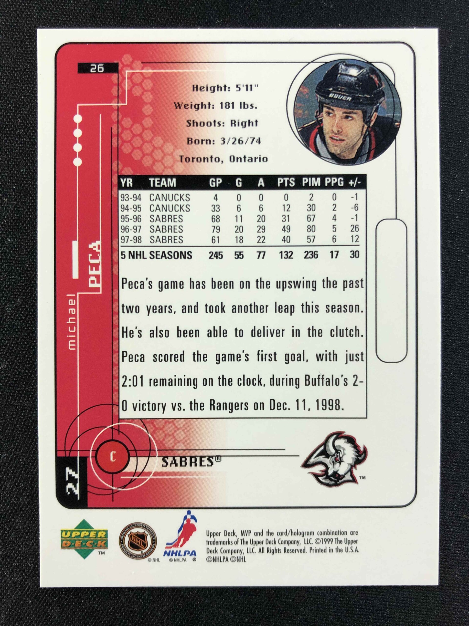 Sběratelská karta 1998/1999 Upper Deck MVP Base 26 Mike Peca