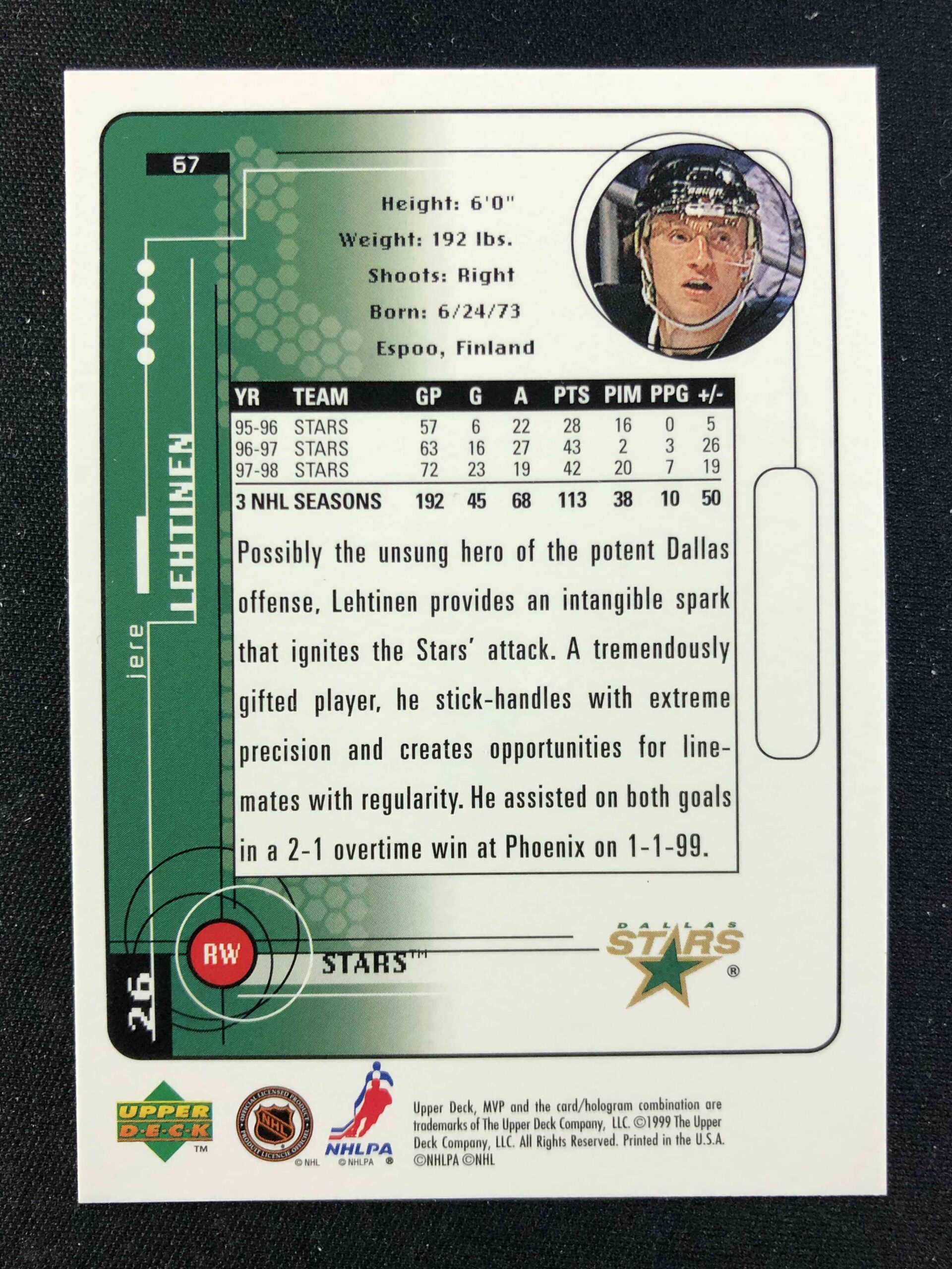 Sběratelská karta 1998/1999 Upper Deck MVP Base 67 Jere Lehtinen