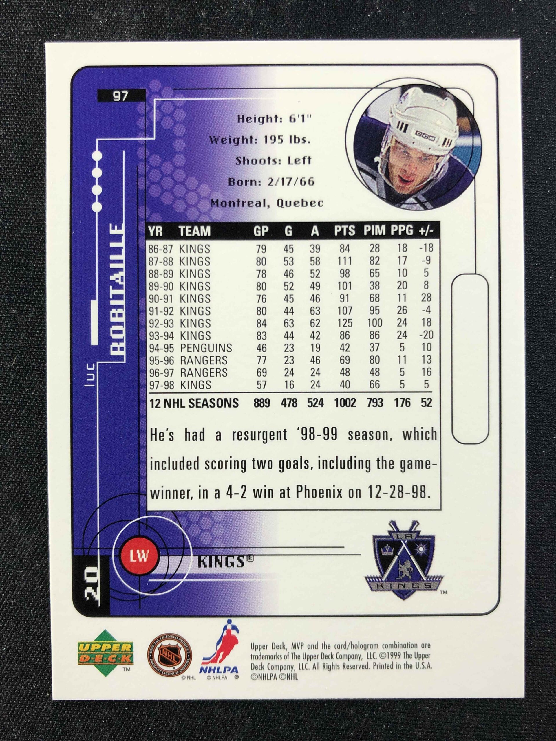 Sběratelská karta 1998/1999 Upper Deck MVP Base 97 Luc Robitaille
