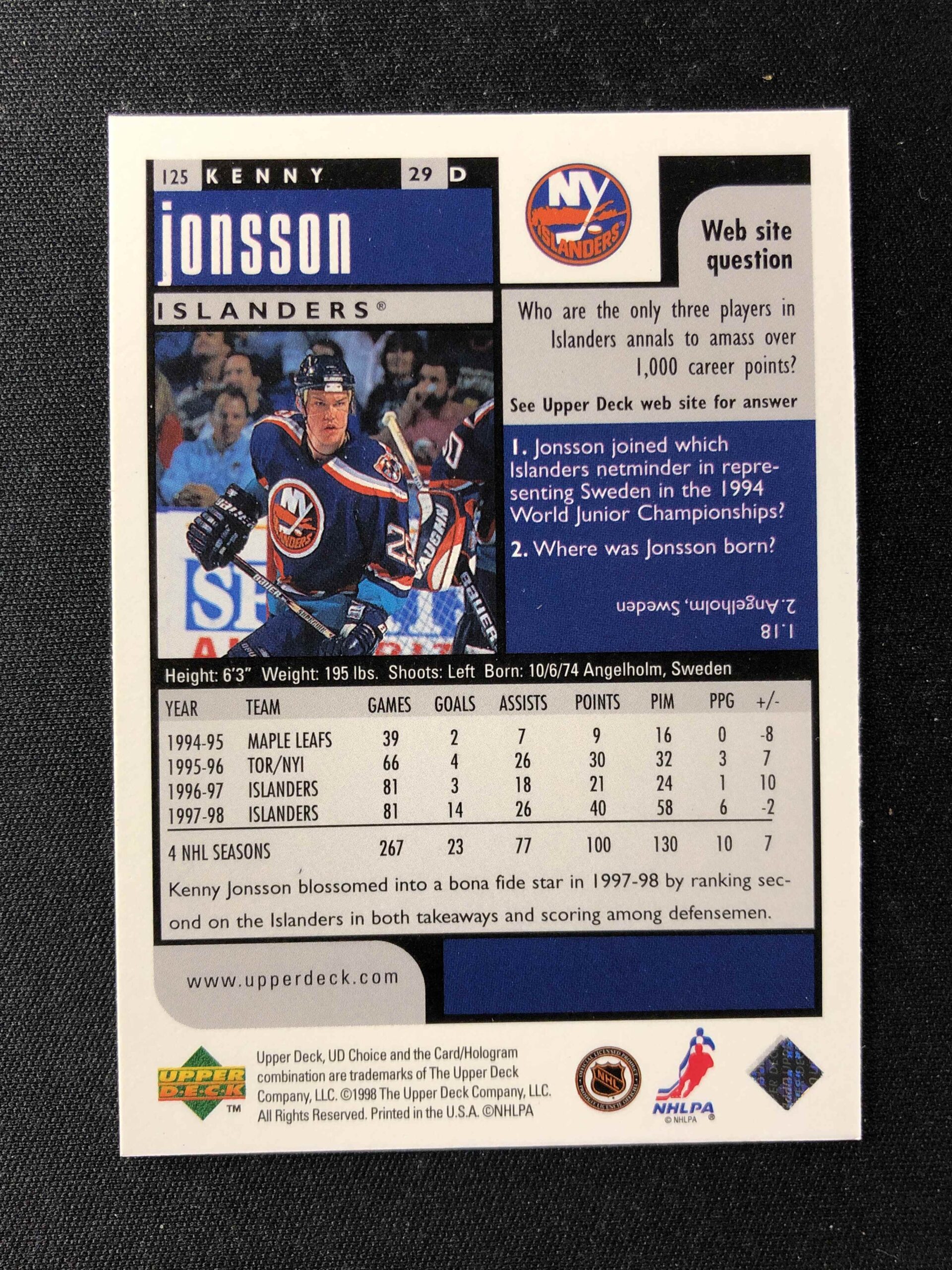 1998/1999 Upper Deck UD Choice Choice Reserve 125 Kenny Jonsson Paralel