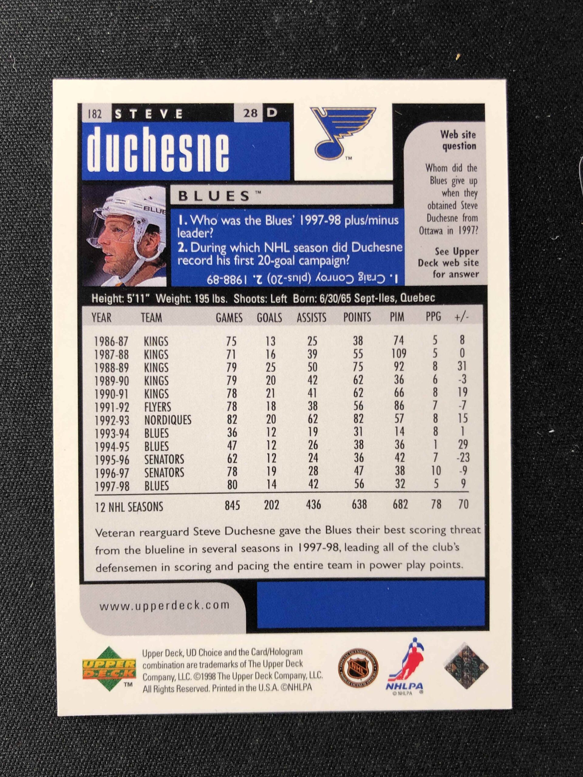 Sběratelská karta 1998/1999 Upper Deck UD Choice Choice Reserve 182 Steve Duchesne Paralel