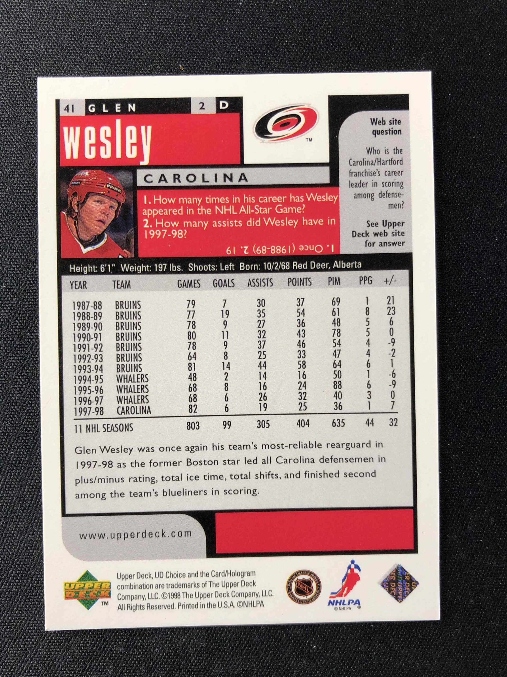 Sběratelská karta 1998/1999 Upper Deck UD Choice Choice Reserve 41 Glen Wesley Paralel