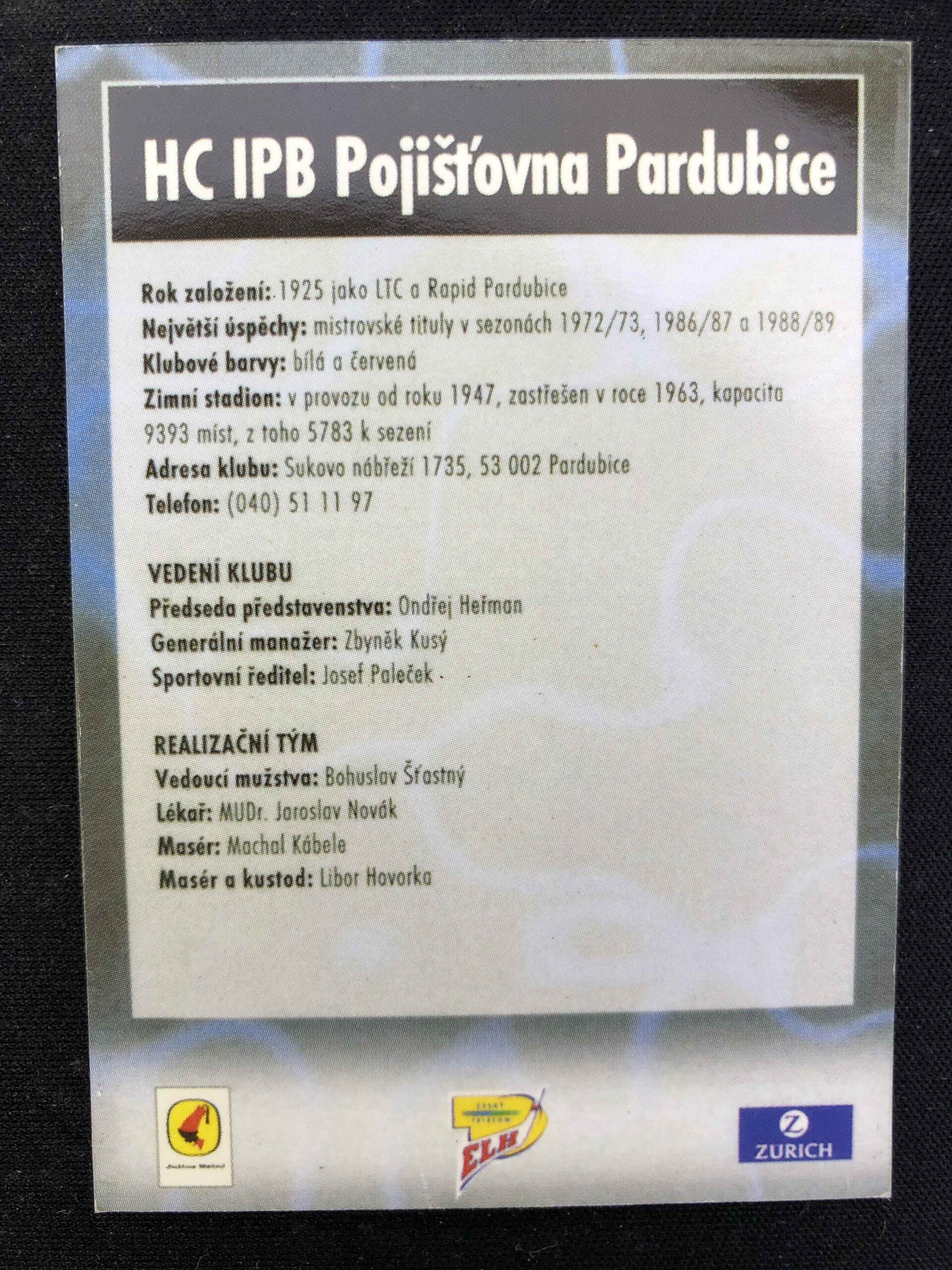 Sběratelská karta 1999/2000 OFS Cards Klubová Karta HC Pardubice