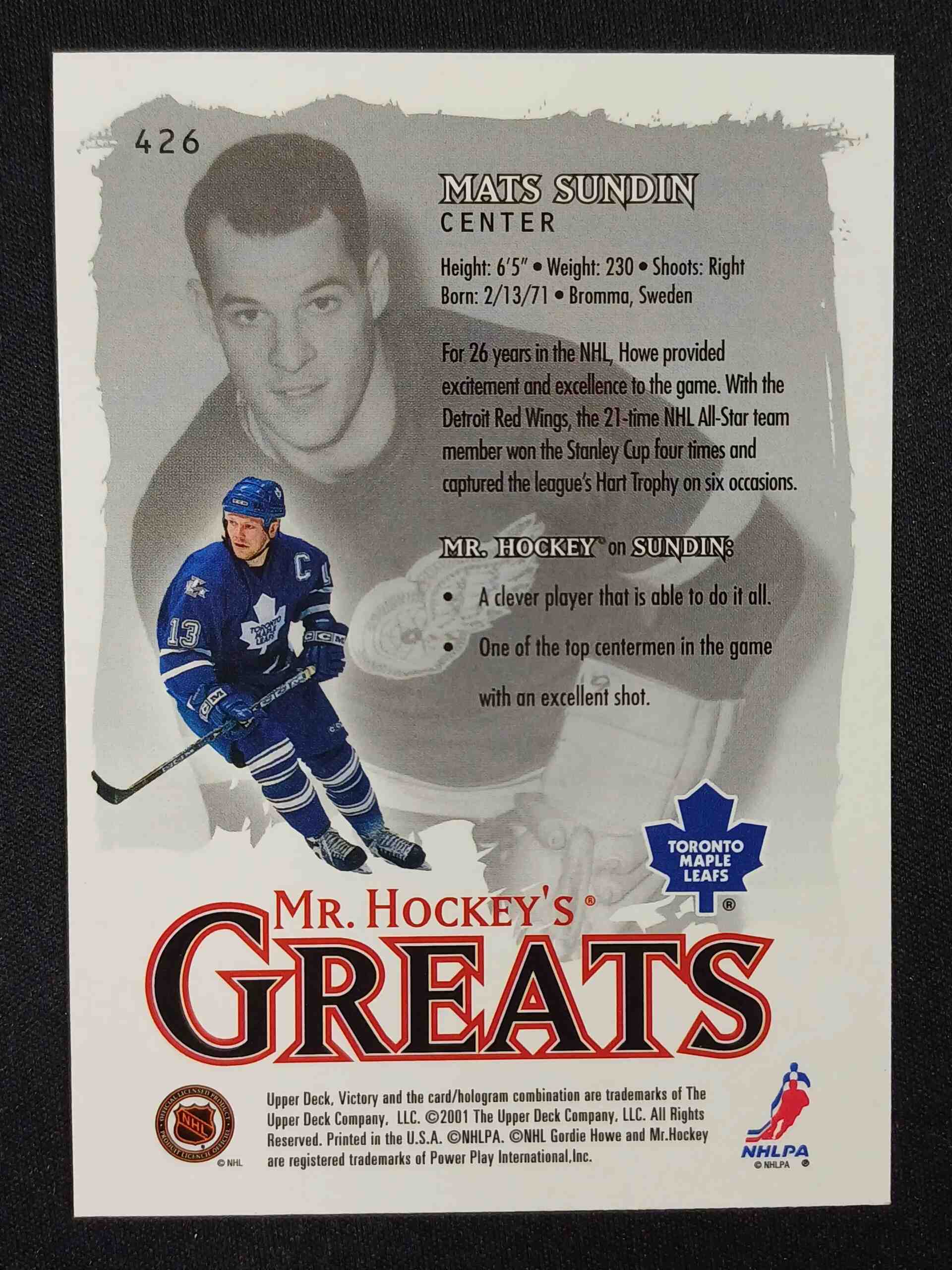 Sběratelská karta 2001/2002 Upper Deck Victory Base 426 Mats Sundin