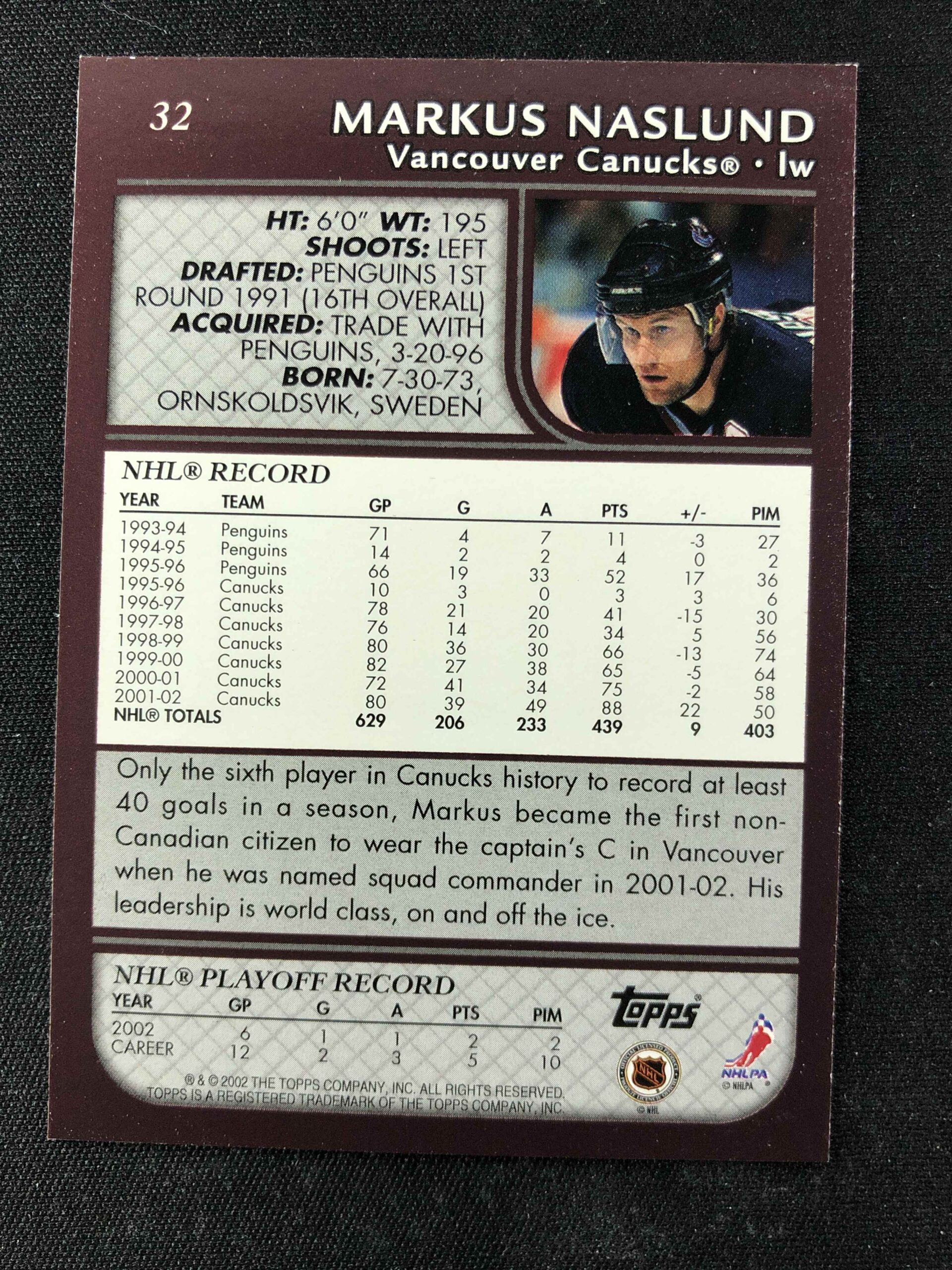 Sběratelská karta 2002/2003 Topps Base 32 Markus Naslund