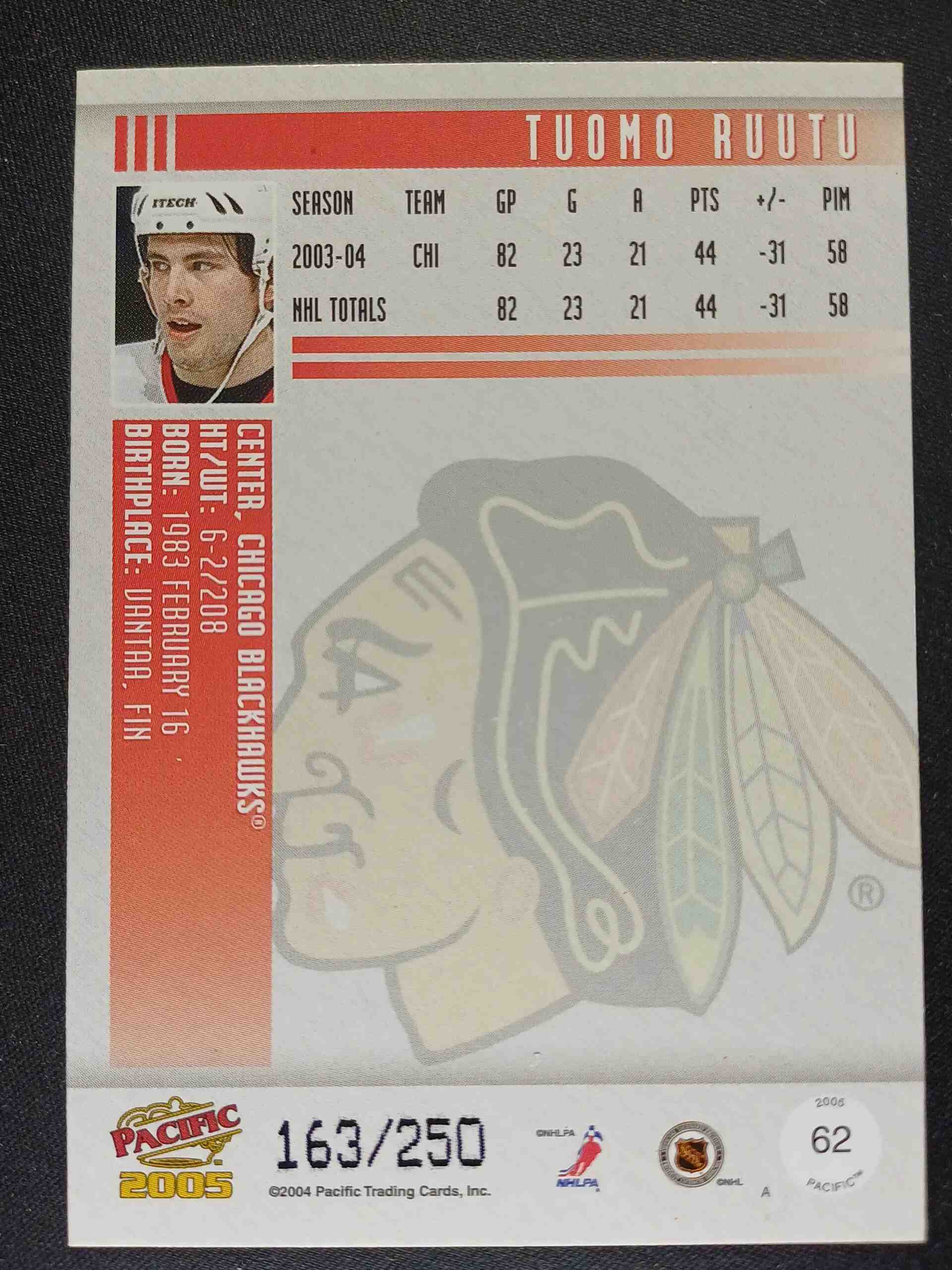 Sběratelská karta 2004/2005 Pacific 2005 Blue Ice 62 Tuomo Ruutu Paralel 163/250