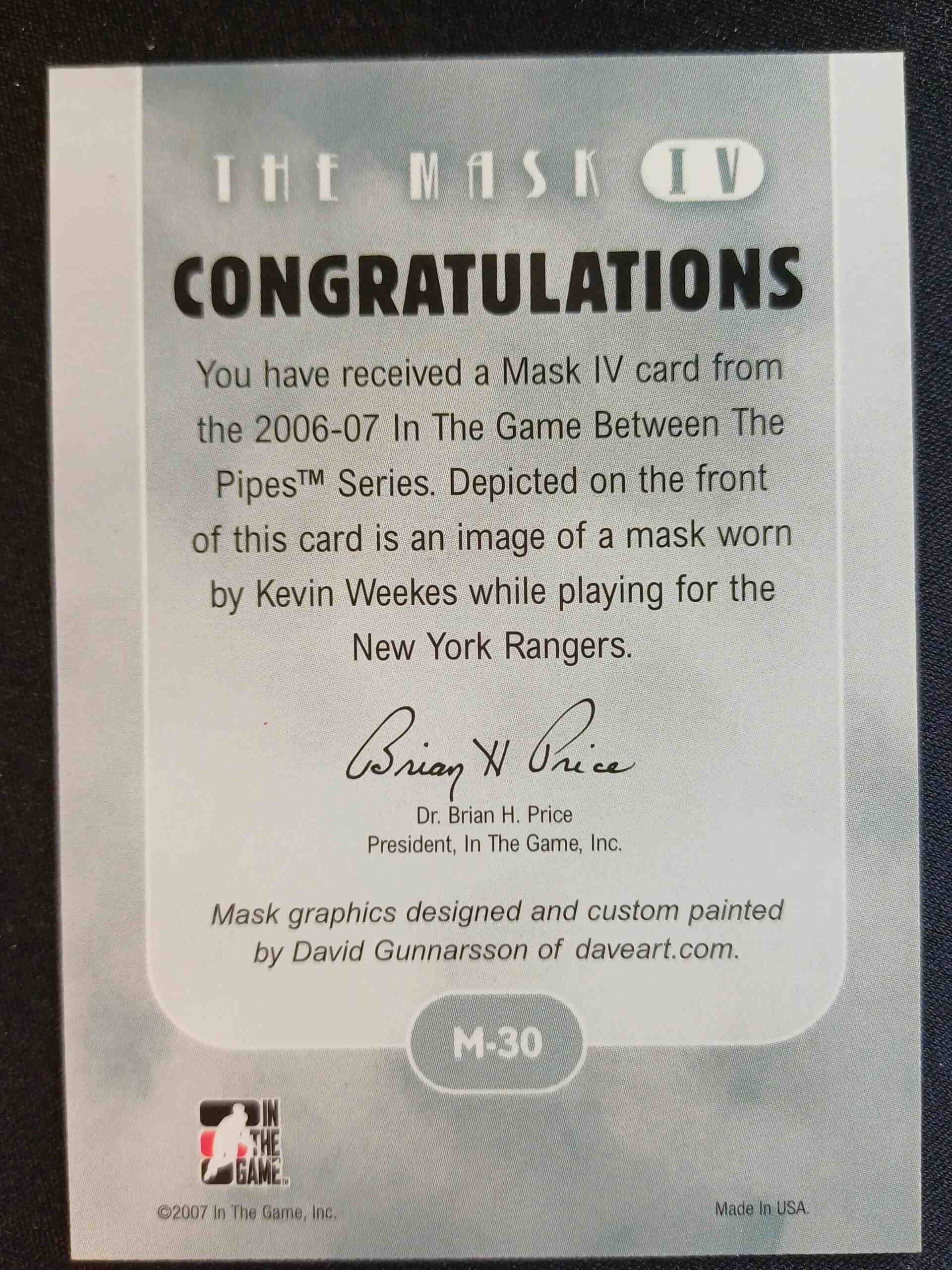 Sběratelská karta 2006/2007 In the Game Between the Pipes The Mask IV M-30 Kevin Weekes Inzert