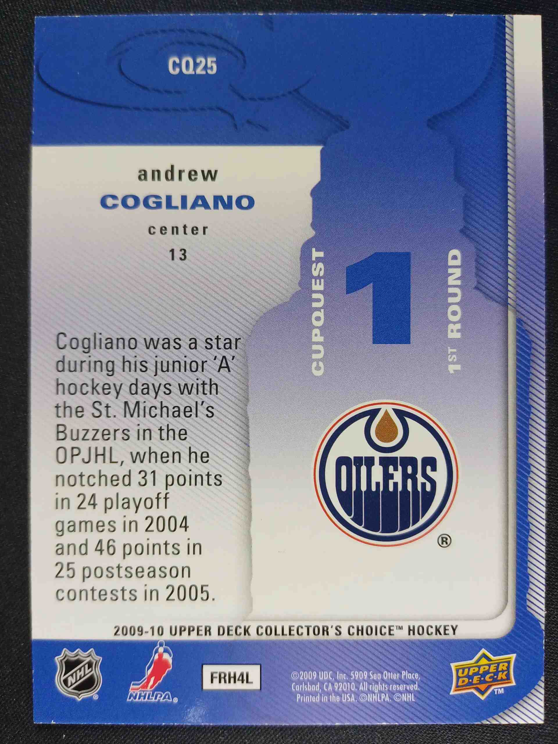 Sběratelská karta 2009/2010 Upper Deck Collectors Choice Cup Quest CQ25 Andrew Cogliano Inzert