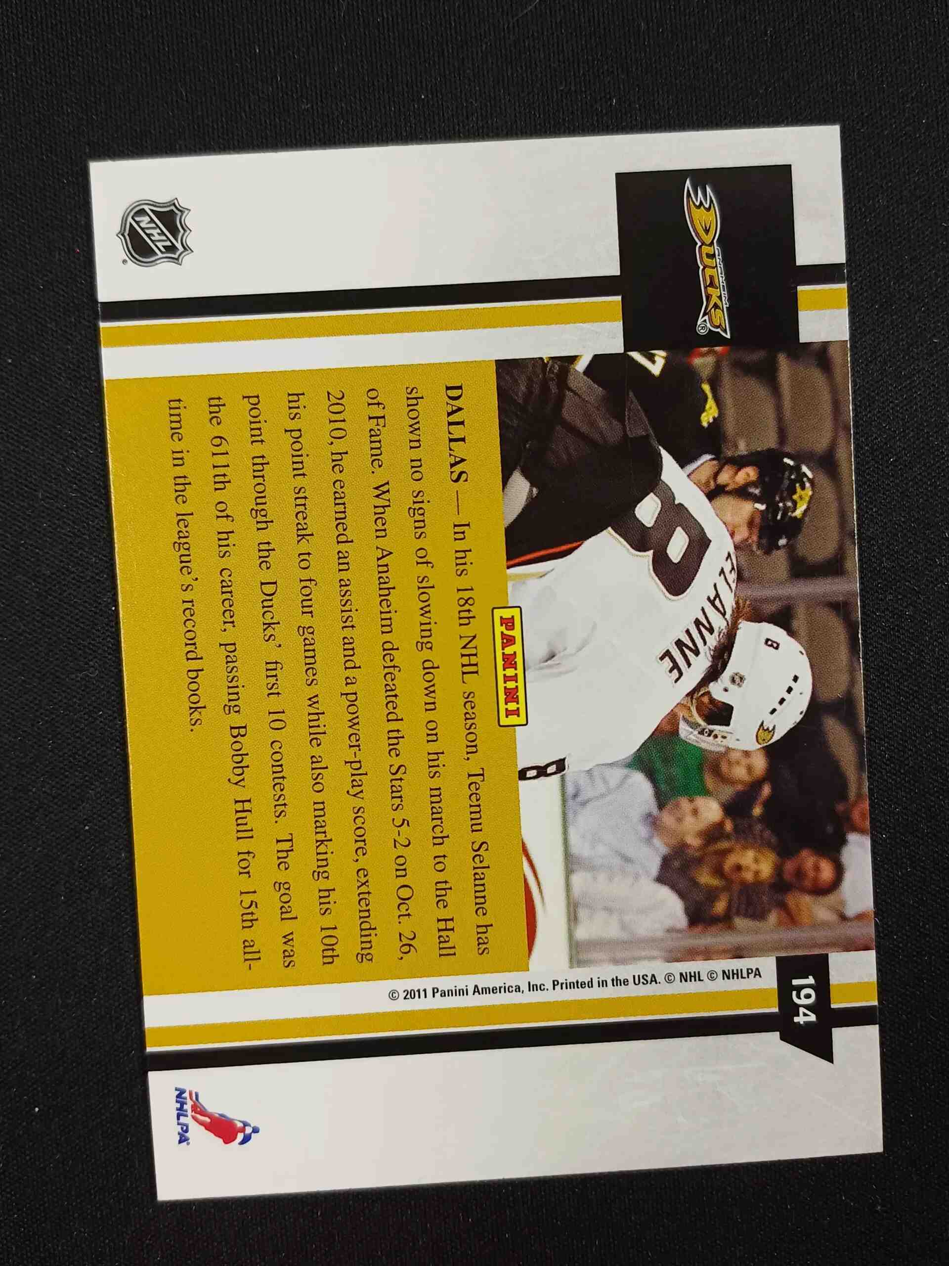 Sběratelská karta 2010/2011 Panini Pinnacle Base 194 Teemu Selanne