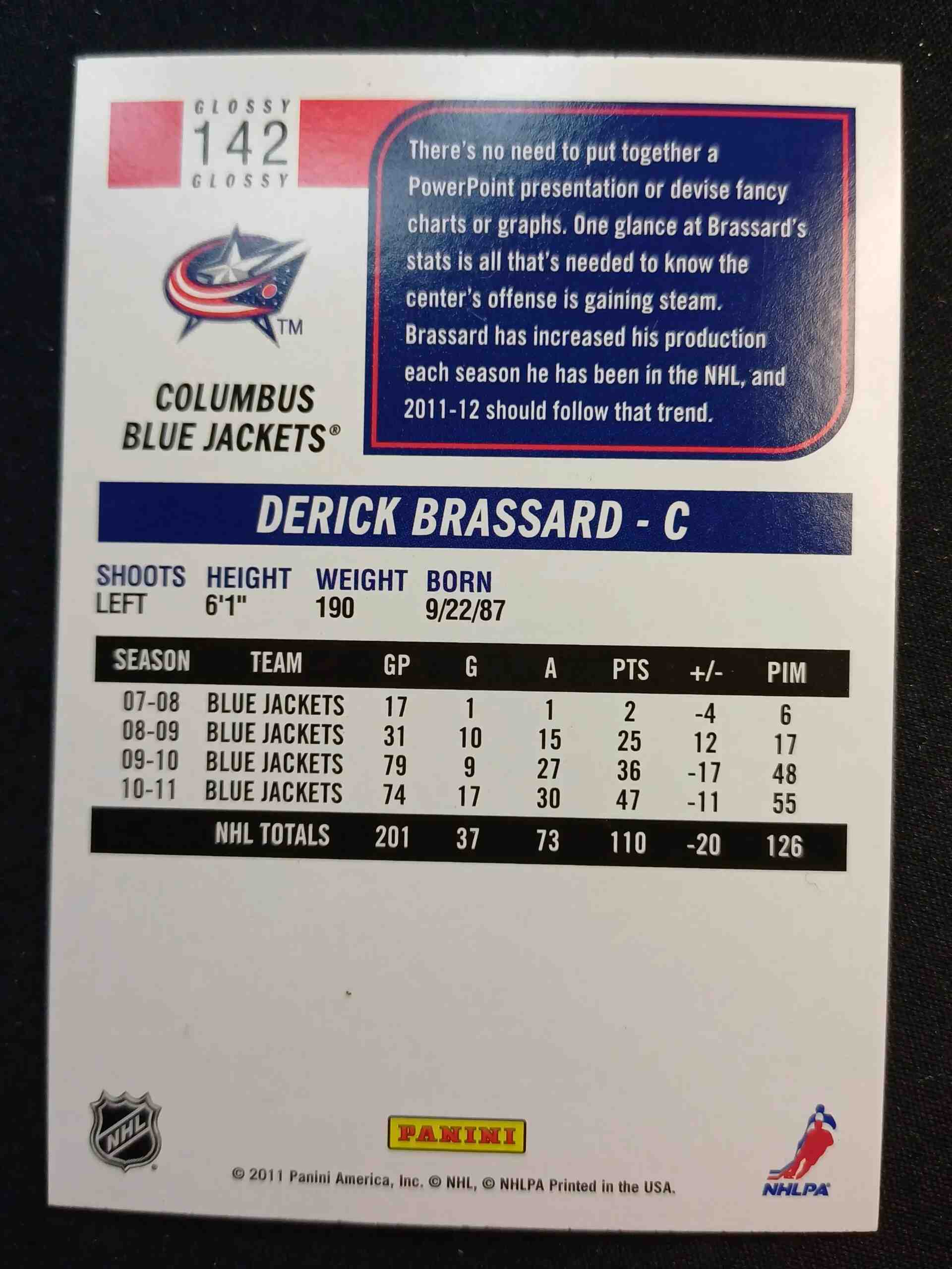 Sběratelská karta 2011/2012 Panini Score Glossy 142 Derick Brassard Paralel