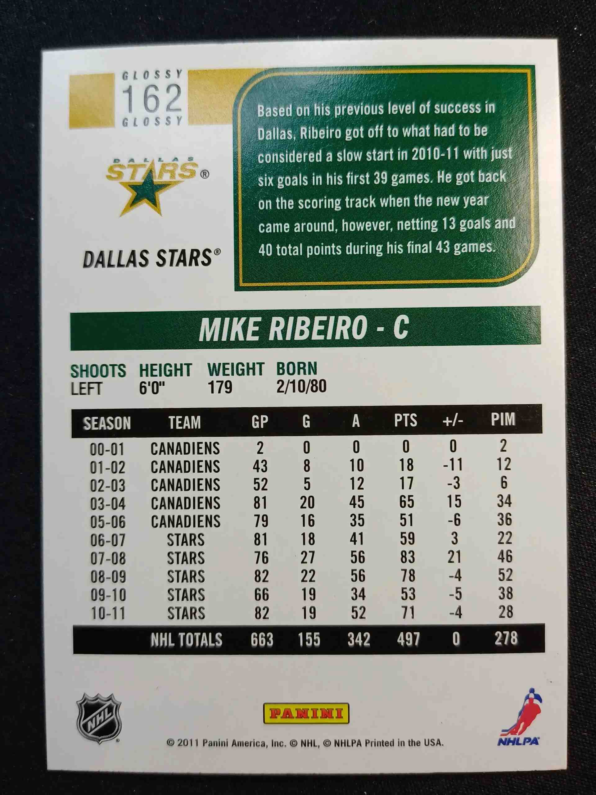 Sběratelská karta 2011/2012 Panini Score Glossy 162 Mike Ribeiro Paralel