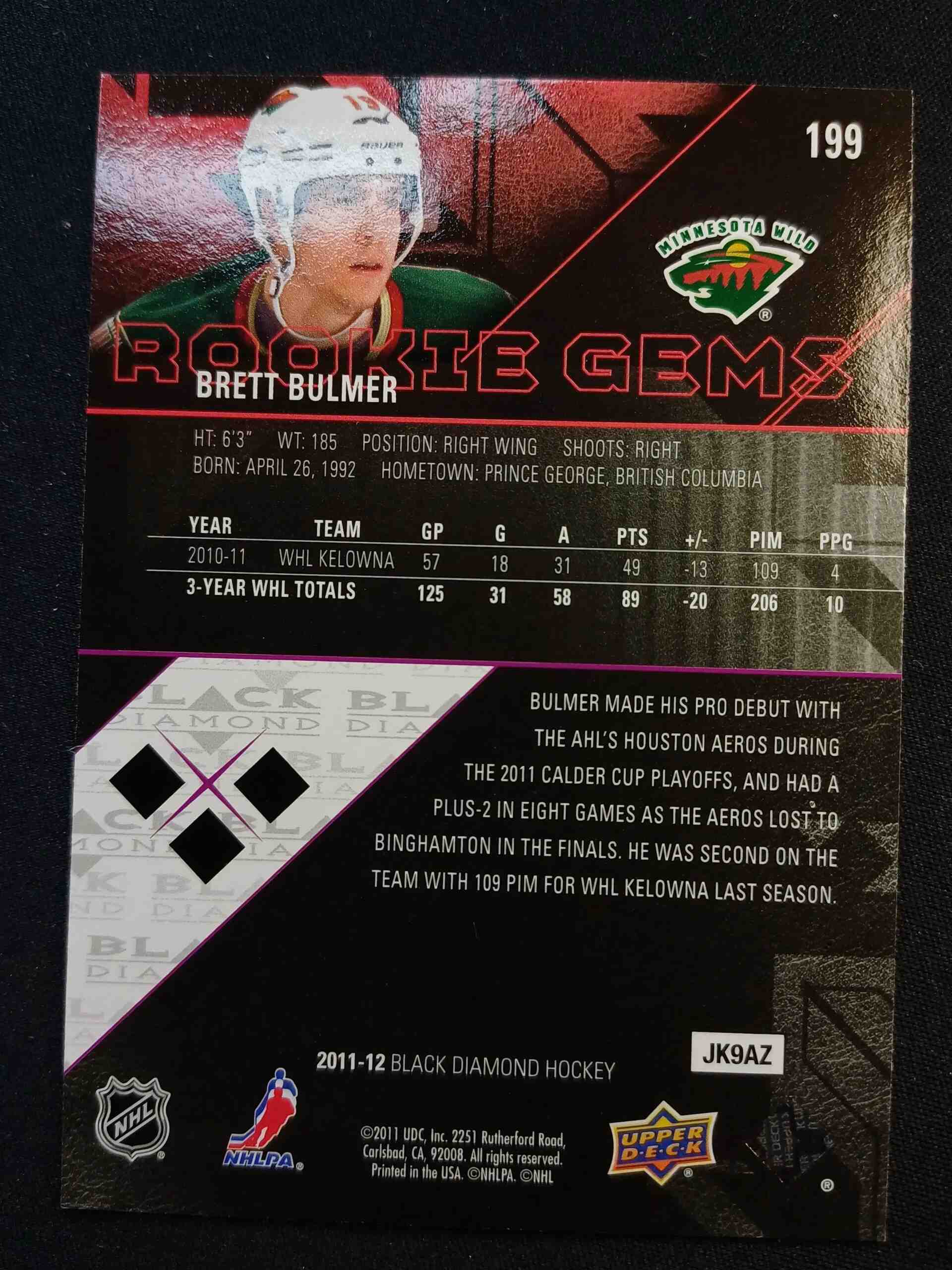 2011/2012 Upper Deck Black Diamond Triple Diamond Rookie Gems 199 Brett Bulmer Paralel