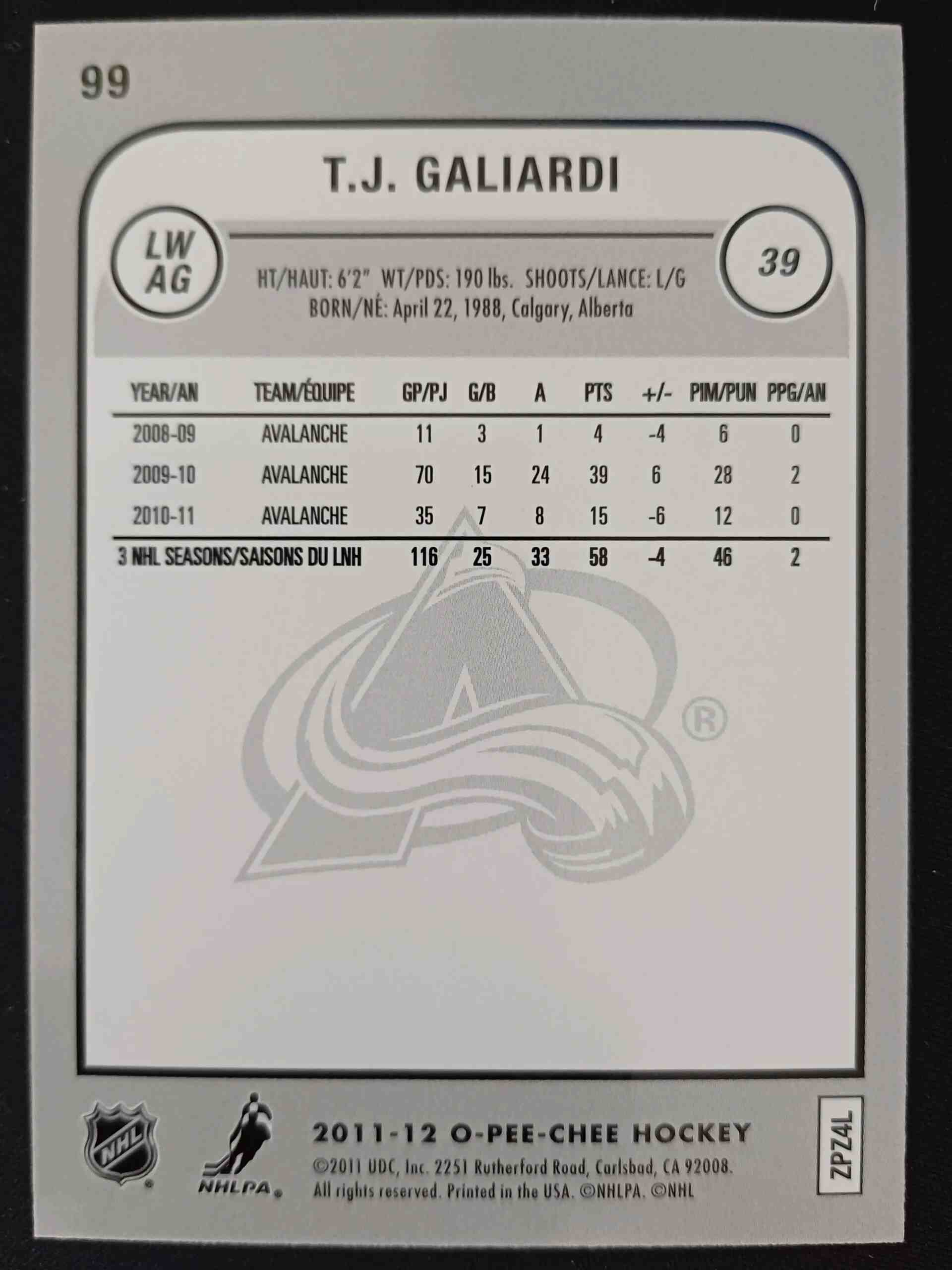 Sběratelská karta 2011/2012 Upper Deck O-Pee-Chee Rainbow 99 T.J. Galiardi Paralel
