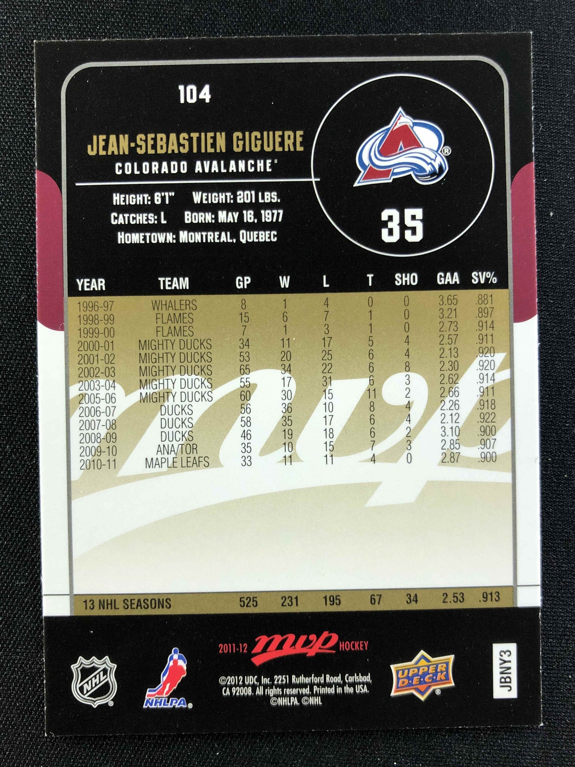Sběratelská karta 2011/2012 Upper Deck Series 2 MVP Update 104 Jean-Sebastien Giguere Inzert