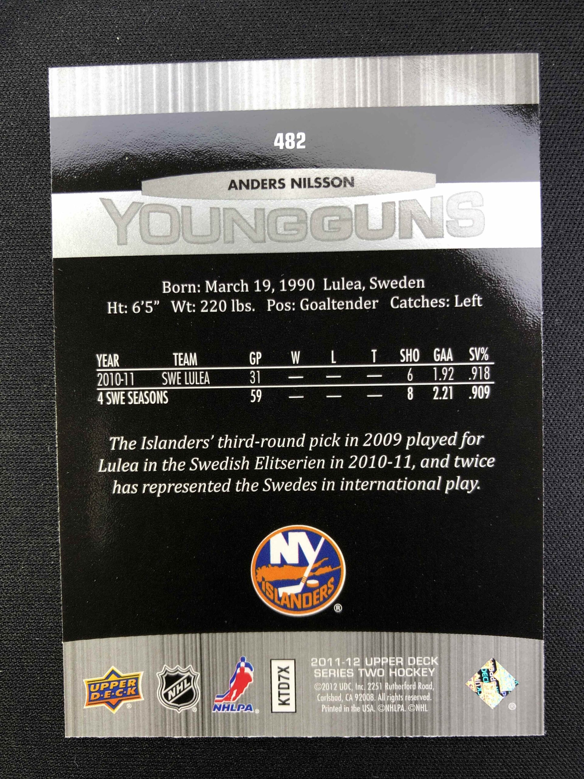 Sběratelská karta 2011/2012 Upper Deck Series 2 Young Guns 482 Anders Nilsson Inzert