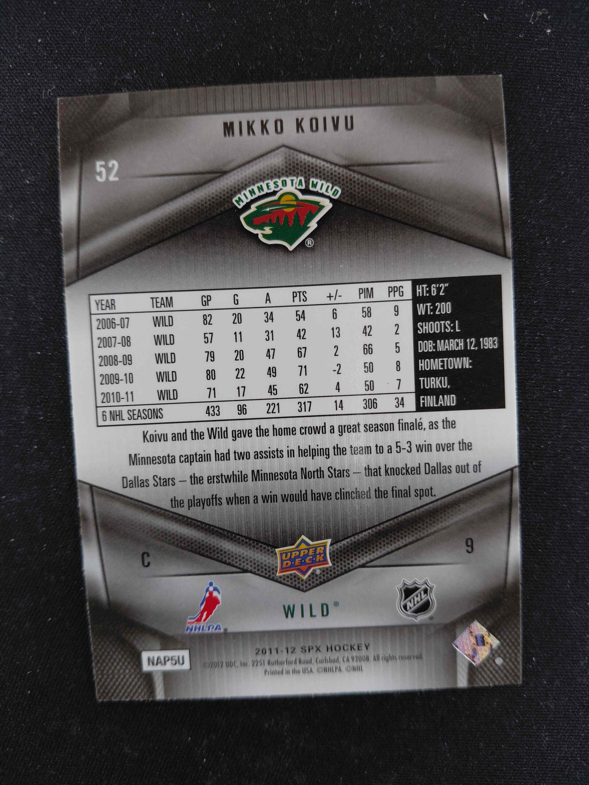 Sběratelská karta 2011/2012 Upper Deck SPx Base 52 Mikko Koivu