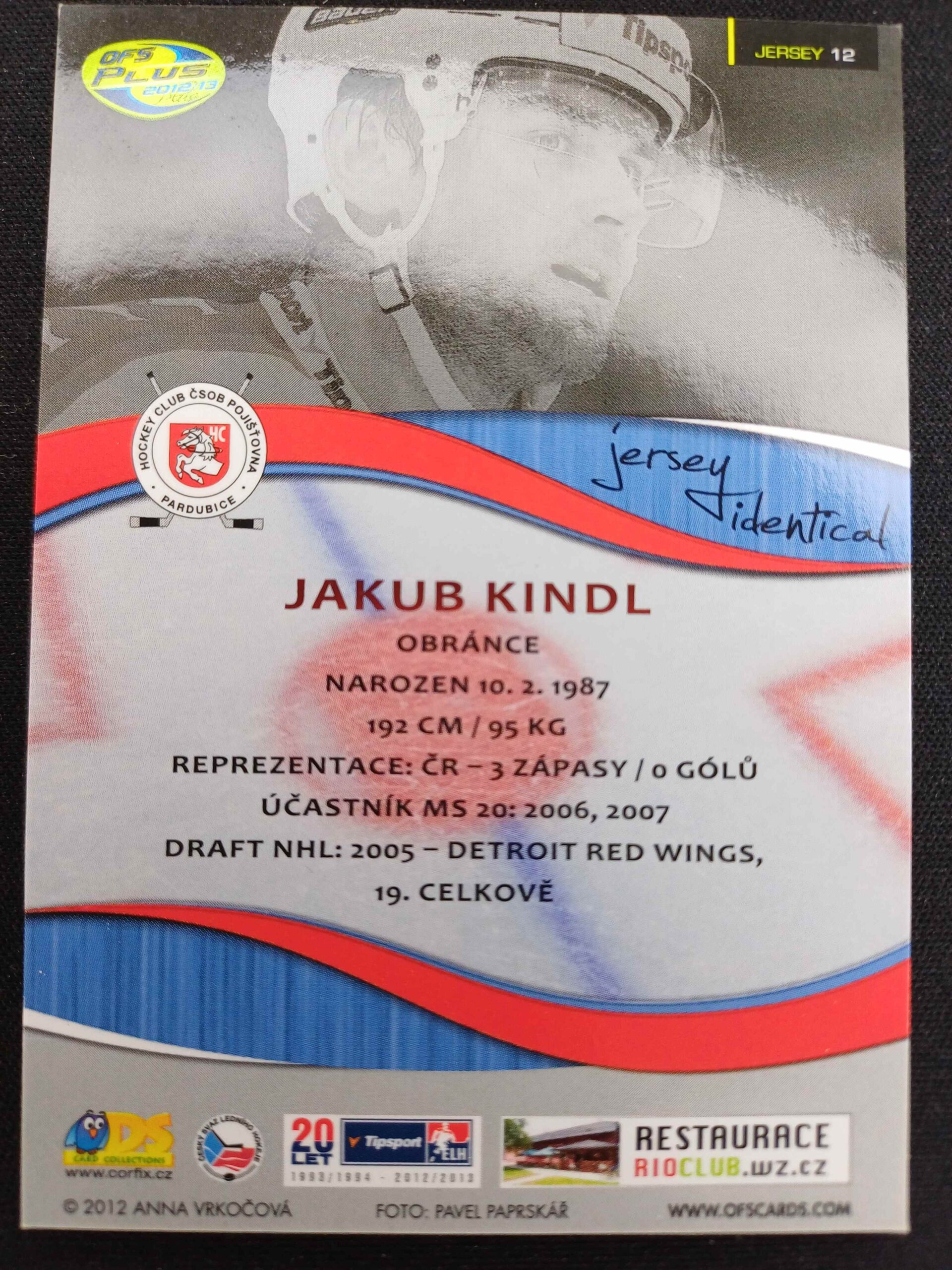 Sběratelská karta 2012/2013 OFS Plus Jersey Identical J12 Jakub Kindl Jersey 175/350
