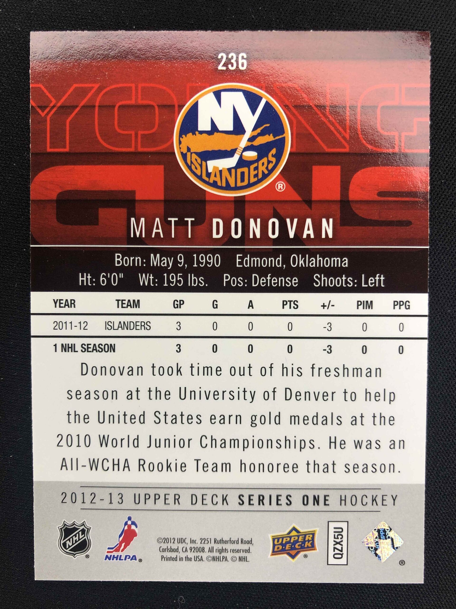Sběratelská karta 2012/2013 Upper Deck Series 1 Young Guns 236 Matt Donovan Inzert