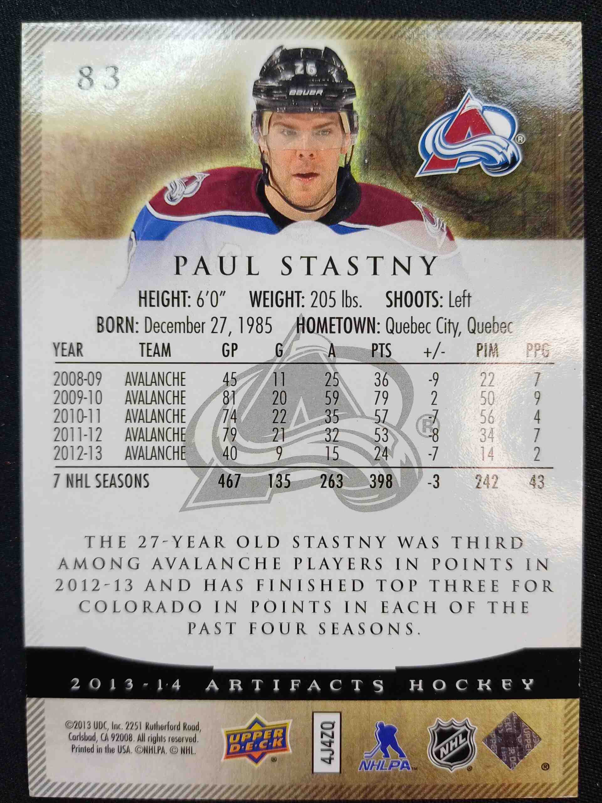 Sběratelská karta 2013/2014 Upper Deck Artifacts Sapphire 83 Paul Stastny Paralel 63/85