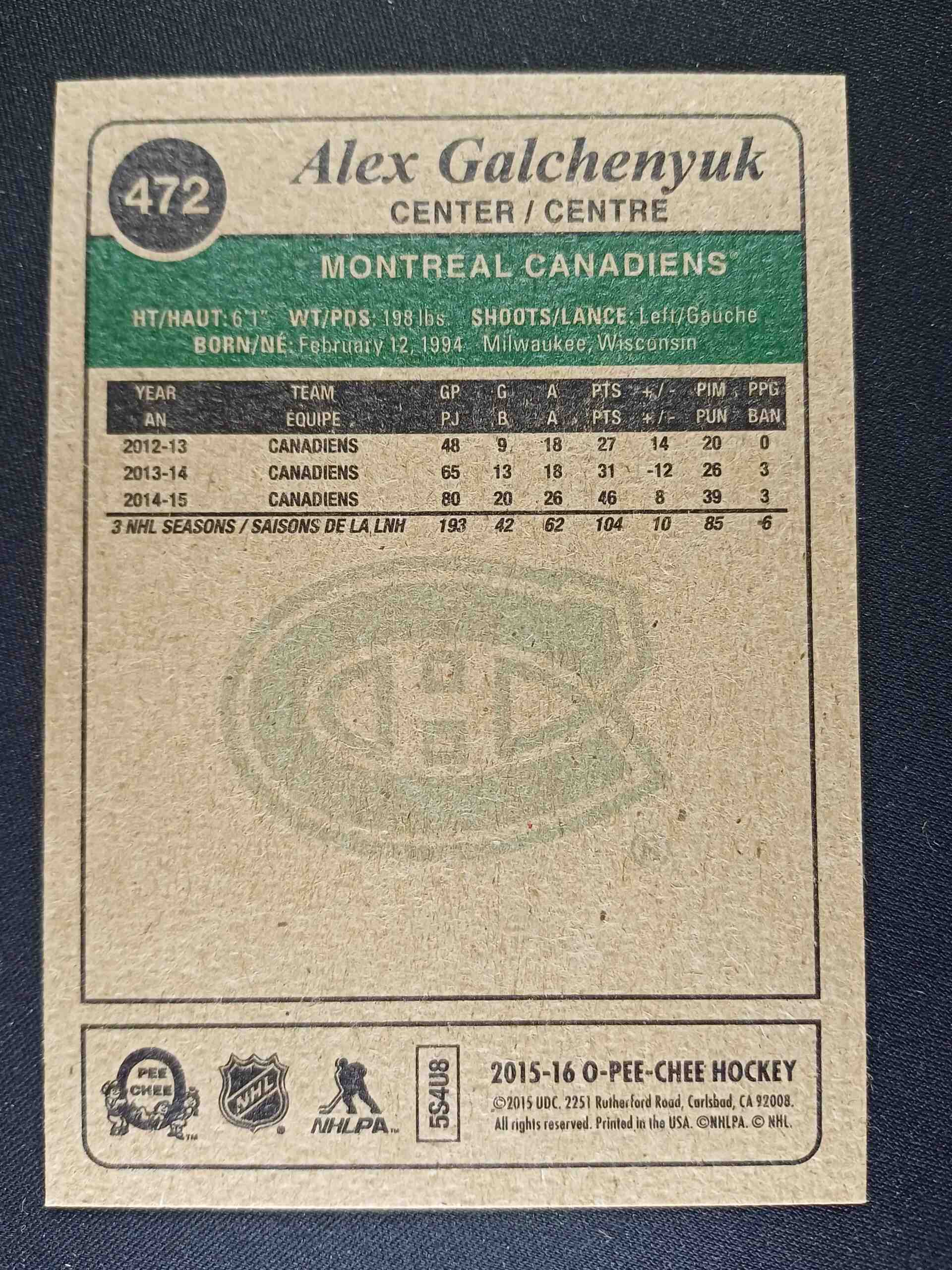 Sběratelská karta 2015/2016 Upper Deck O-Pee-Chee Retro 472 Alex Galchenyuk Paralel
