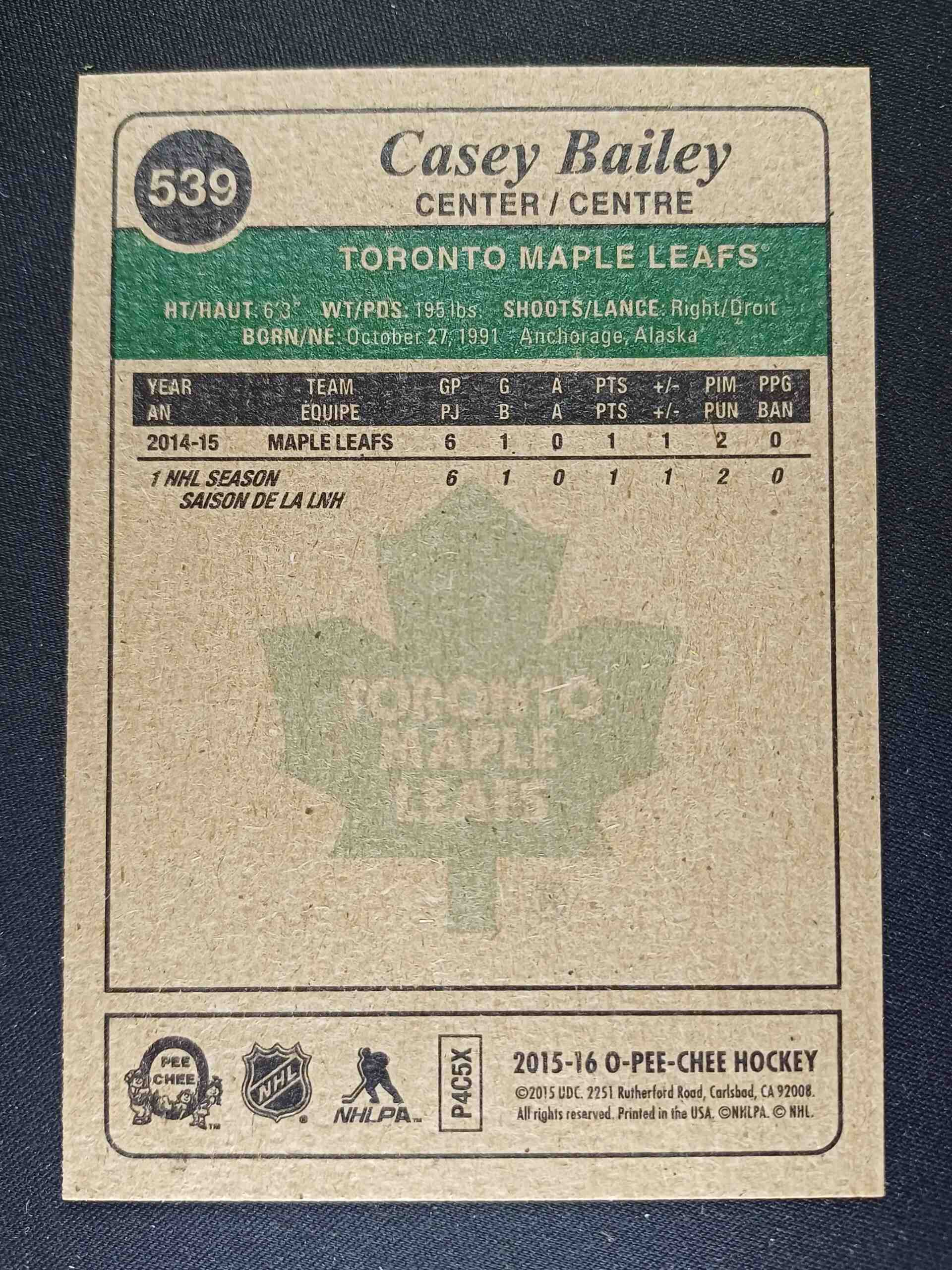 Sběratelská karta 2015/2016 Upper Deck O-Pee-Chee Retro 539 Casey Bailey Paralel