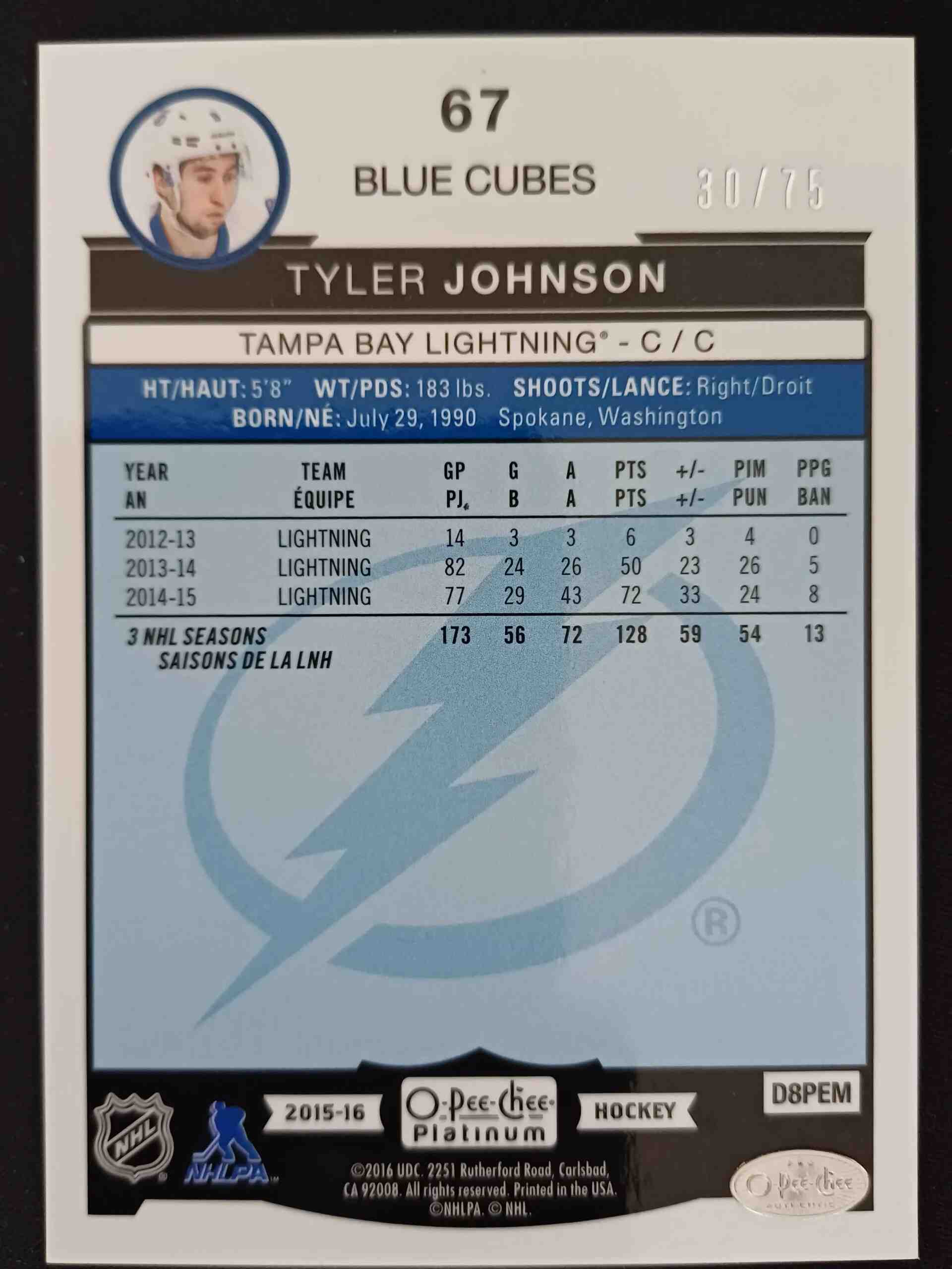 Sběratelská karta 2015/2016 Upper Deck OPC Platinum Blue Cubes 67 Tyler Johnson Paralel 30/75