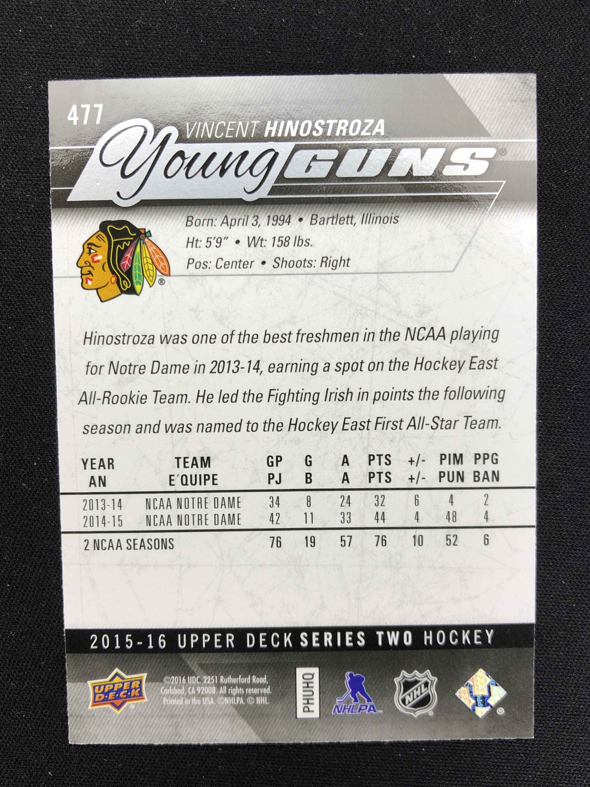 2015/2016 Upper Deck Series 2 Young Guns 477 Vincent Hinostroza Inzert