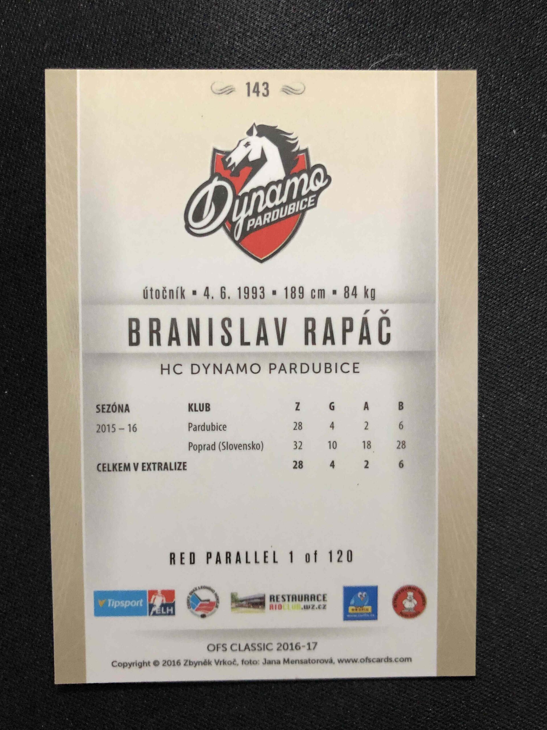 Sběratelská karta 2016/2017 OFS Classic Red 143 Branislav Rapáč Paralel /120