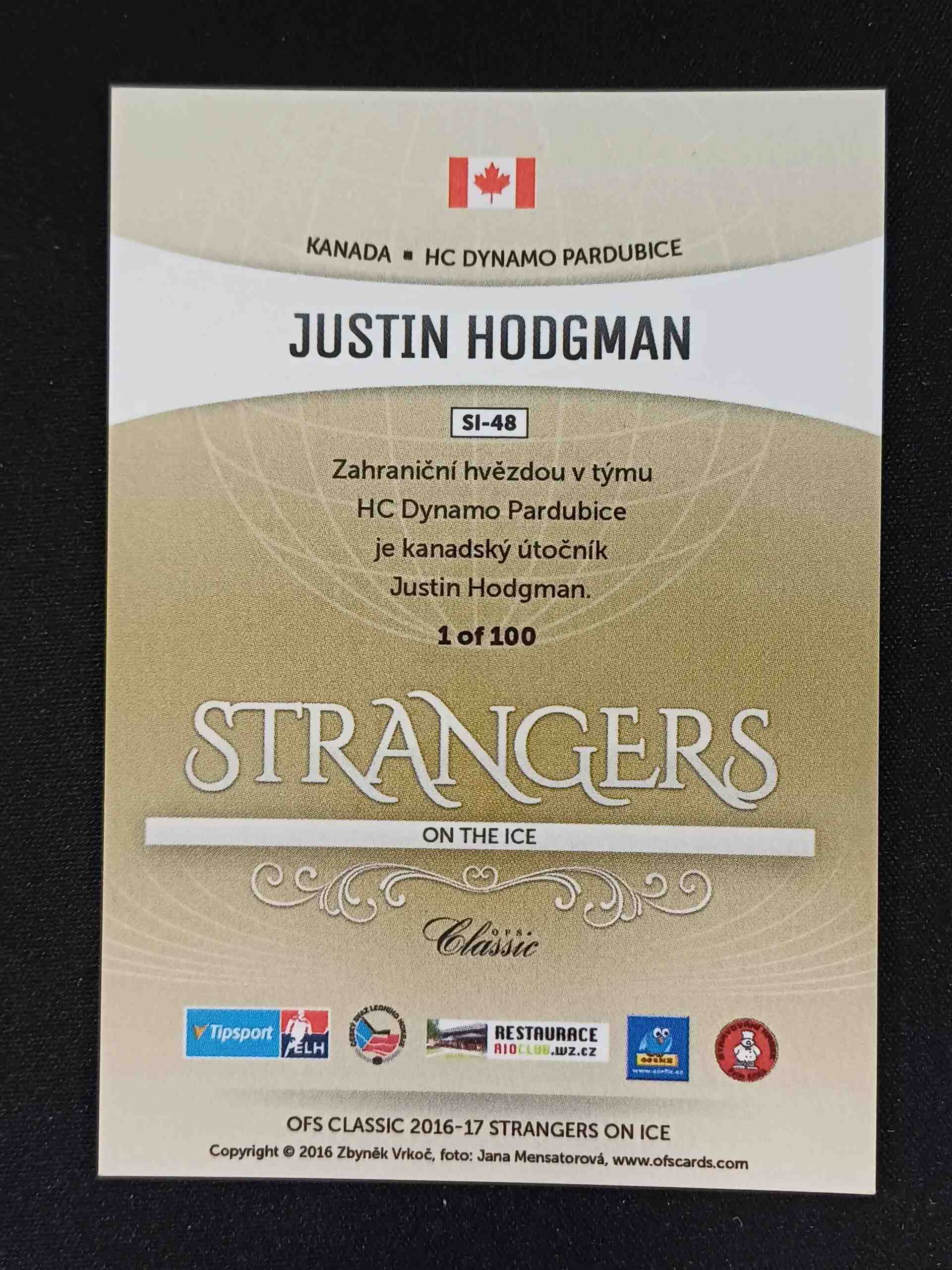 Sběratelská karta 2016/2017 OFS Classic Strangers on the Ice SI-48 Justin Hogman Inzert /100