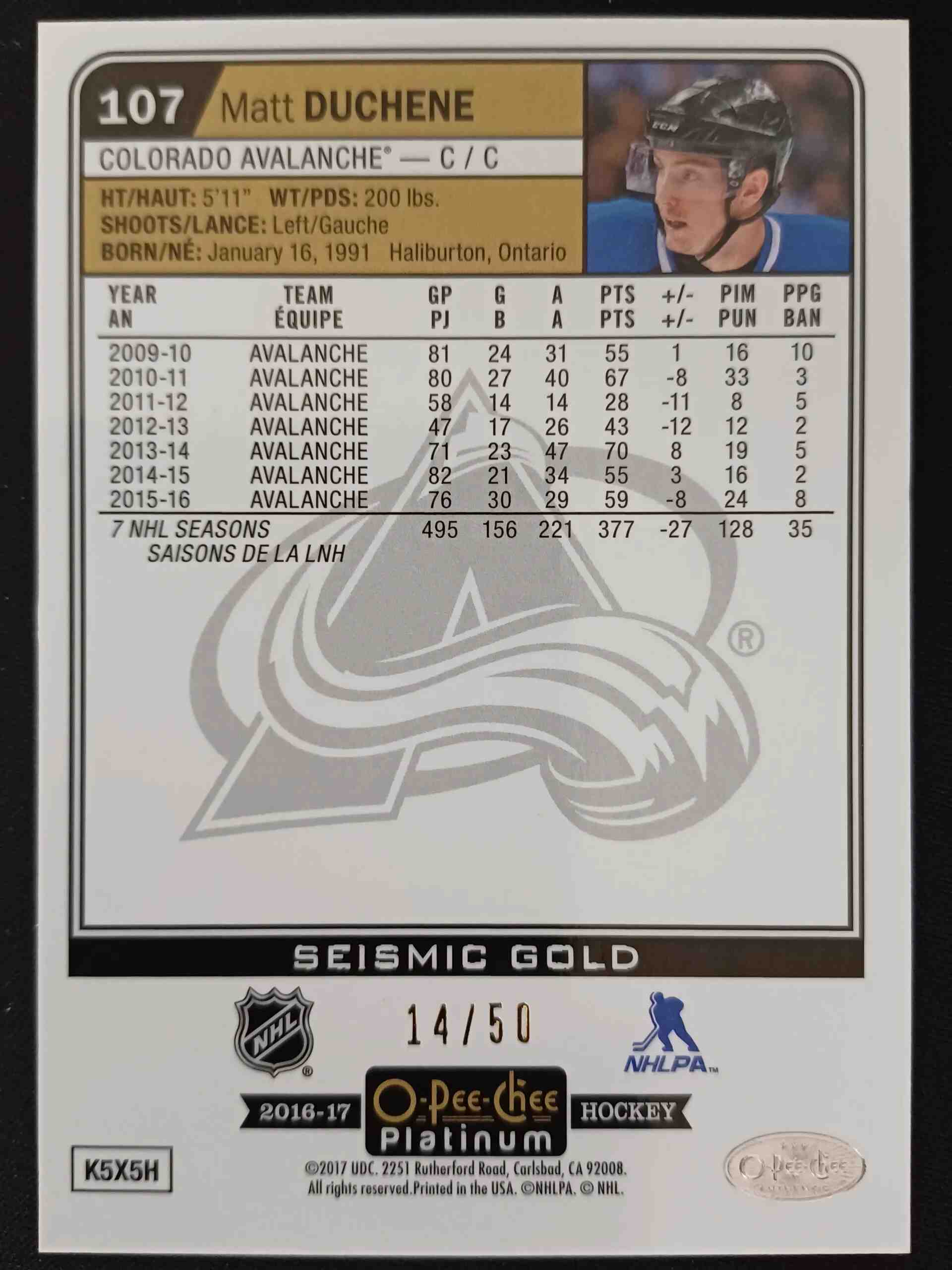 Sběratelská karta 2016/2017 Upper Deck OPC Platinum Seismic Gold 107 Matt Duchene Paralel 14/50