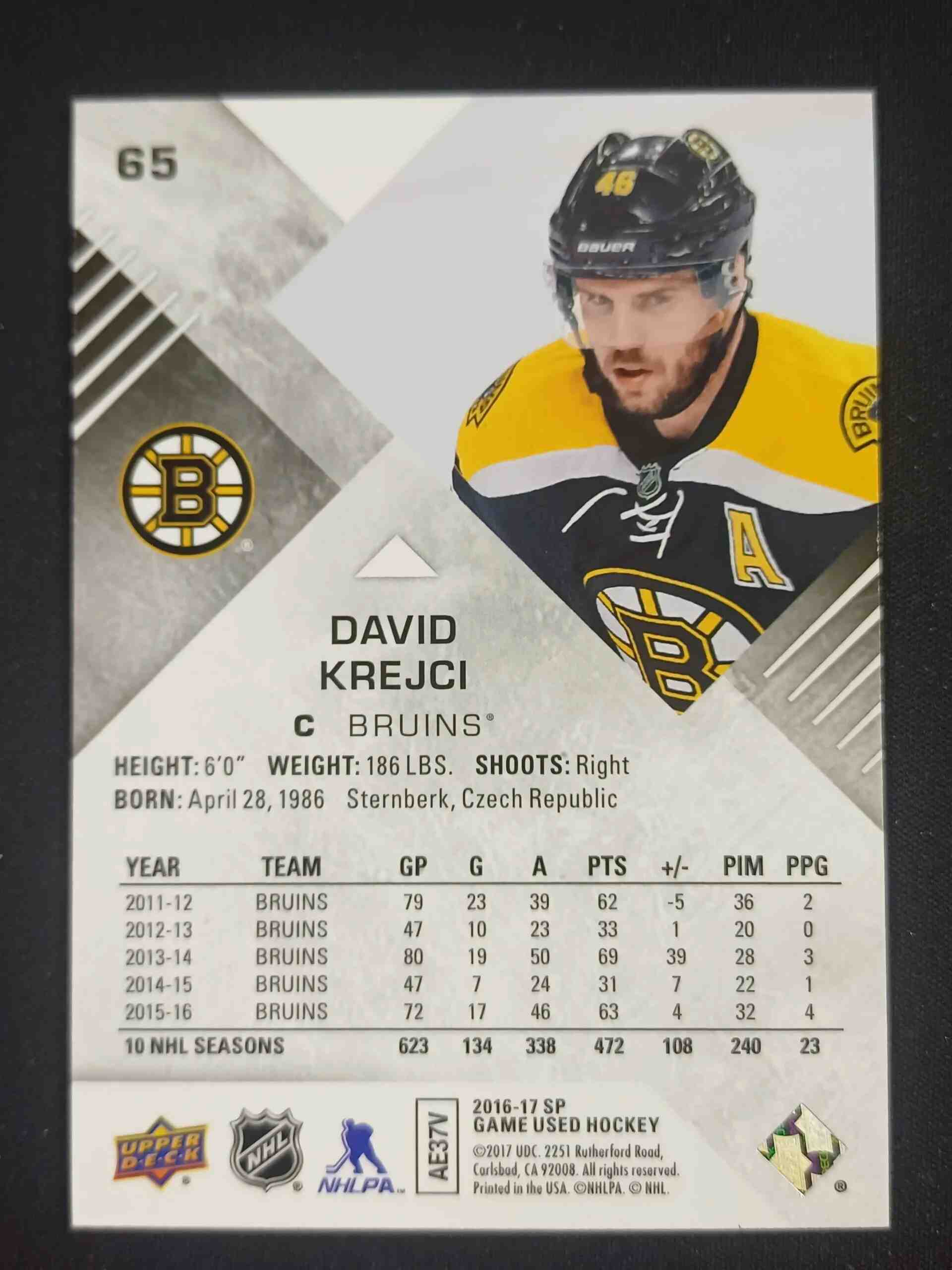 Sběratelská karta 2016/2017 Upper Deck SPGU Purple 65 David Krejci Paralel