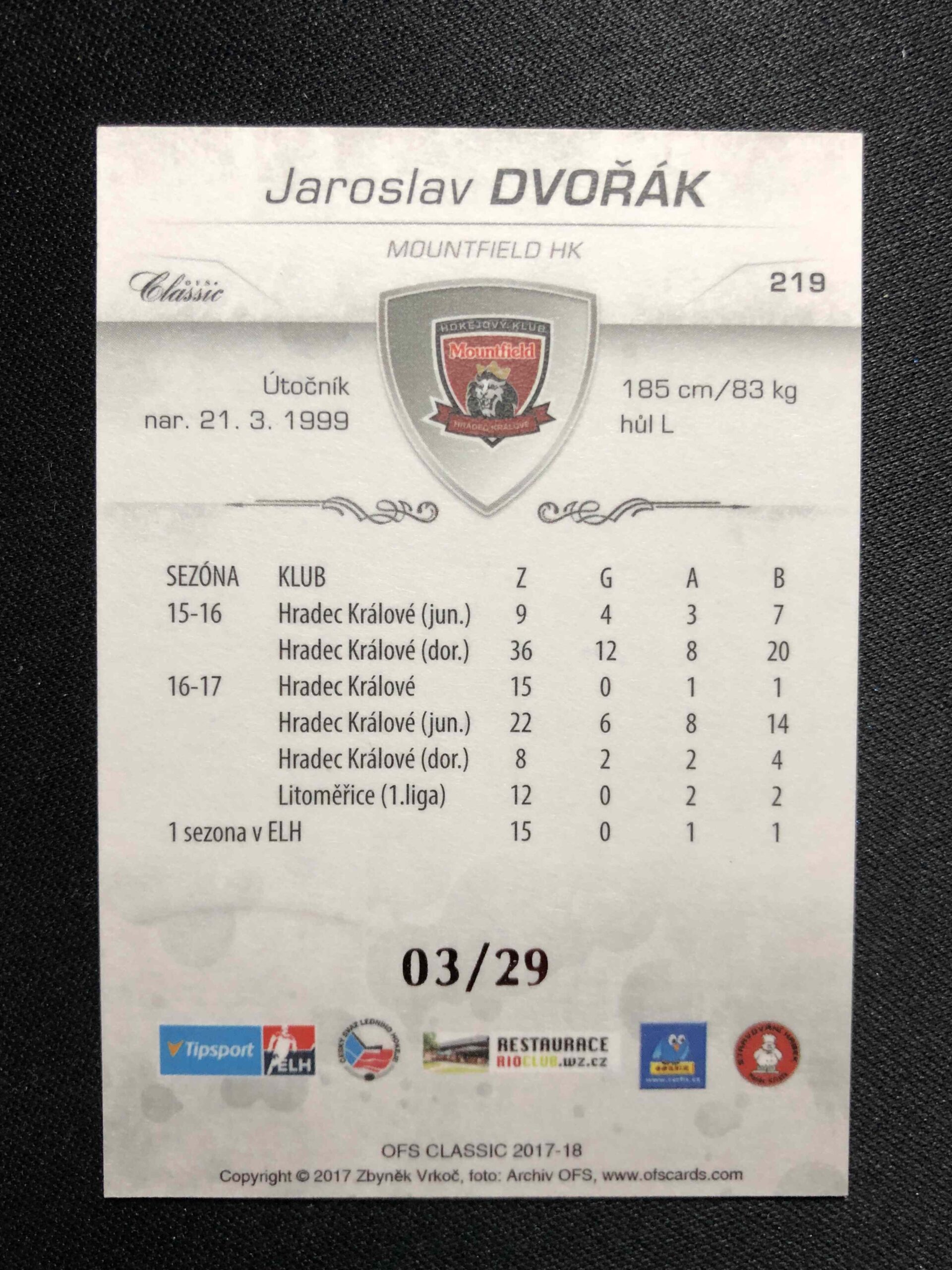 Sběratelská karta 2017/2018 OFS Classic Red 219 Jaroslav Dvořák Paralel 03/29