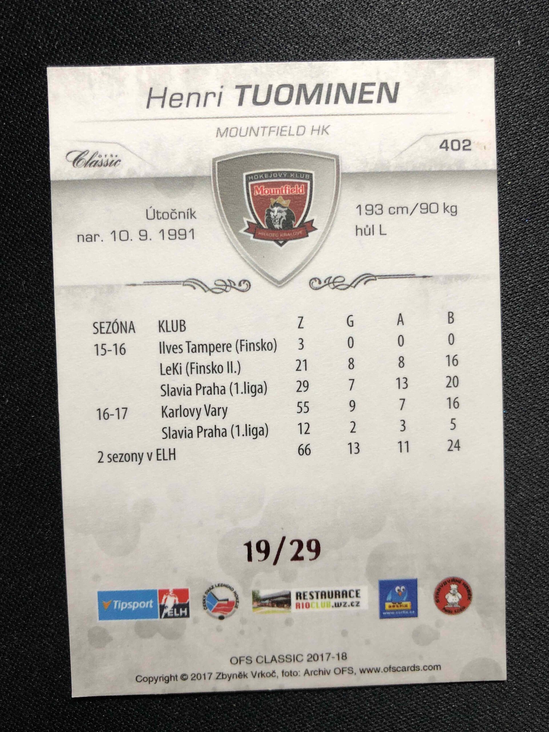 Sběratelská karta 2017/2018 OFS Classic Red 402 Henri Tuominen Paralel 19/29