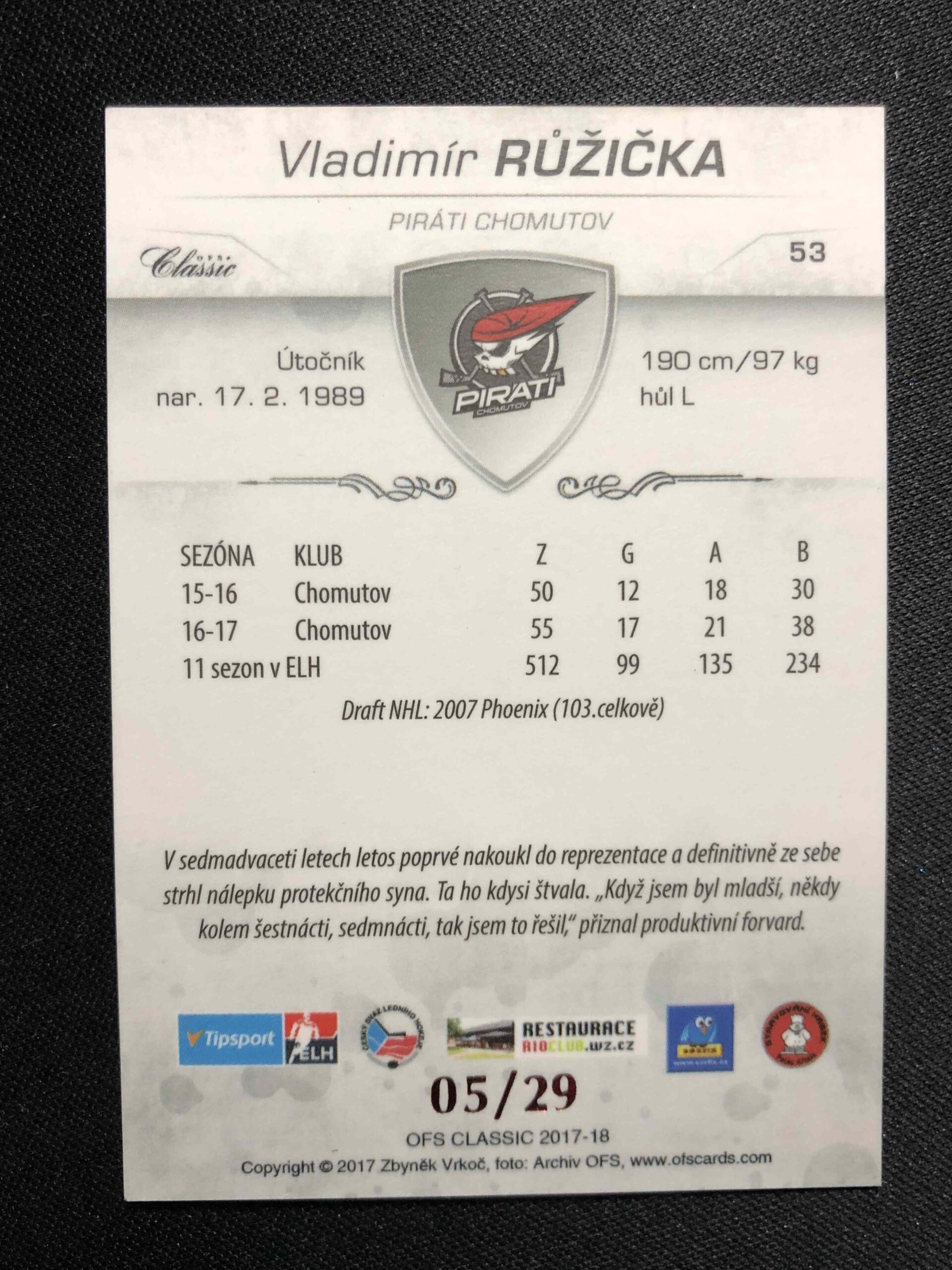 Sběratelská karta 2017/2018 OFS Classic Red 53 Vladimír Růžička Paralel 05/29